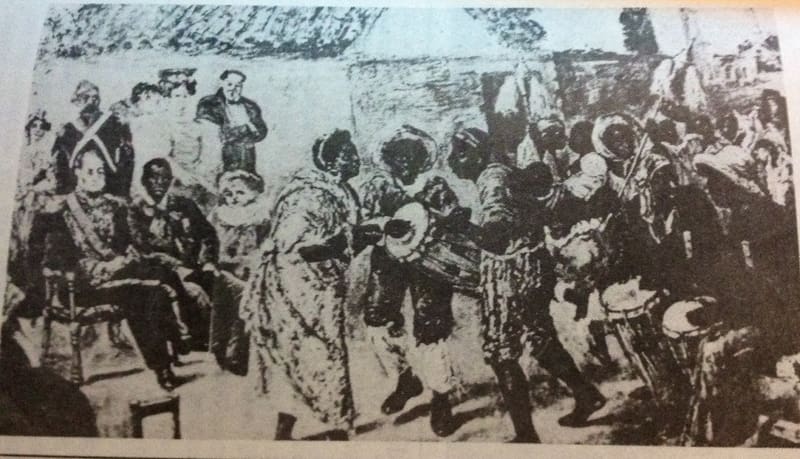 Uno de los primeros ejemplos de tango que hacen alusión a lo negro es de 1867 y se intitula “El negro schicoba”. Se trata de blancos que imitaban a los negros al disfrazarse de vendedores de escobas, pero también imitaban al escobero, la función de quien abría a la comparsa al paso de los candomberos negros. De algún modo el negro resiste la extinción indirectamente ya que el blanco que compuso la letra lo menciona vívidamente. Parte de sus versos dicen así: