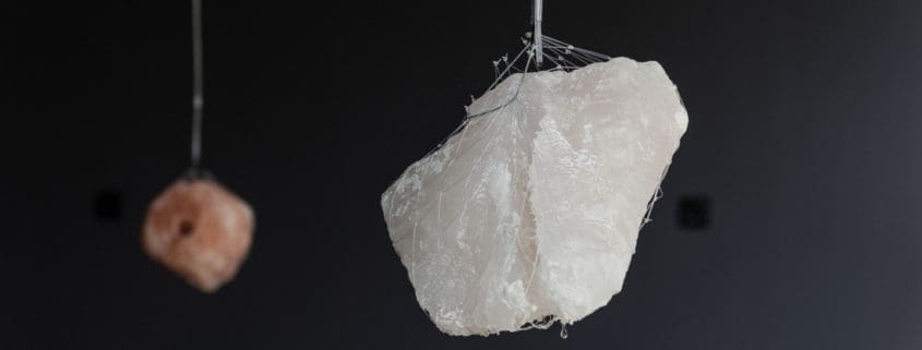 La sensación, para quien camina entre la instalación, es de una lenta pero cadente sinfonía. “La sal es como una lagrima. La gota produce un silencio que te hace reflejar y ganar conciencia de uno mismo. Mientras caminas, consigues sentirla en el aire”, dice la artista. Según Haloba, la opción por las piedras de sal como materia central en esa instalación se justifica por la voluntad de retratar los fluidos corporales y, al tiempo, hacer referencia a la sal como materia-prima, fuente de conflictos, intereses económicos pero también de resistencia – como en el caso de Gandhi en India.
