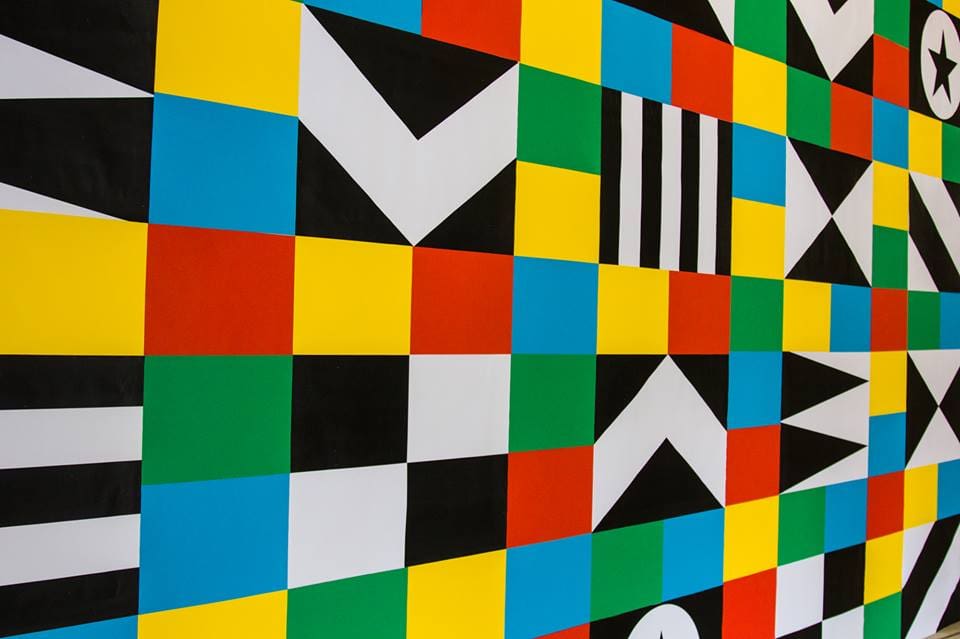 La artista Lakwena Maciver quien toma su inspiración de los diseños y la comunicación usados en la cultura popular, el arte callejero y la publicidad que coexisten en el entorno urbano, creó este fantástico mural hecho con cartulinas de colores.