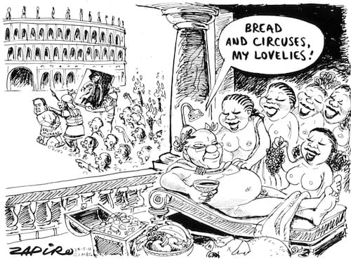 - Zapiro: «De parte de mis cuatro mujeres, 22 hijos, 13 otros hijos fuera del matrimonio (o eran 14?) y mis numerosas amantes, ¡estoy indignado por ser pintado como un mujeriego!»