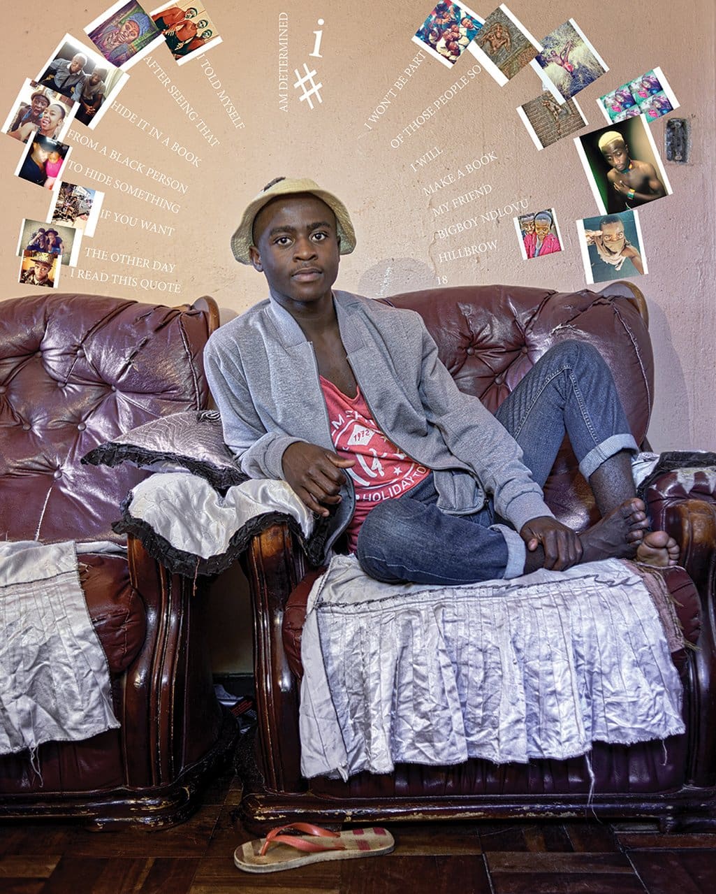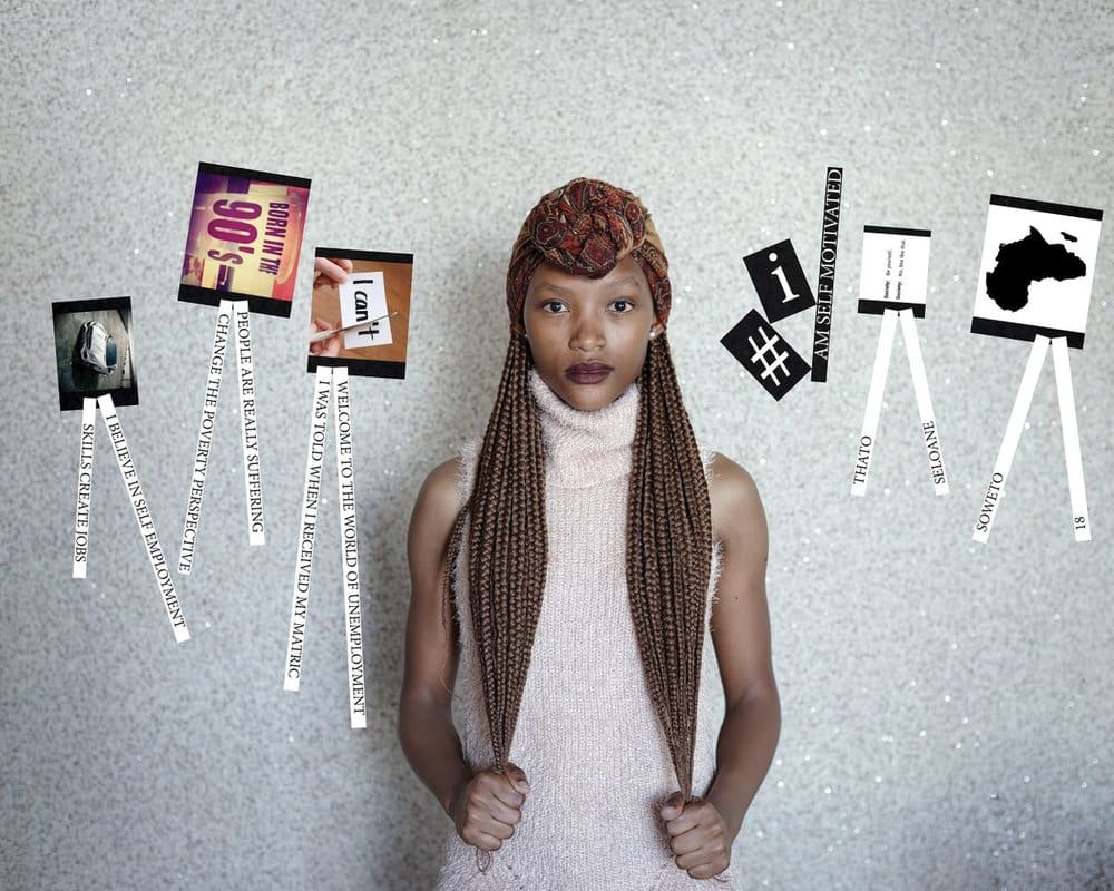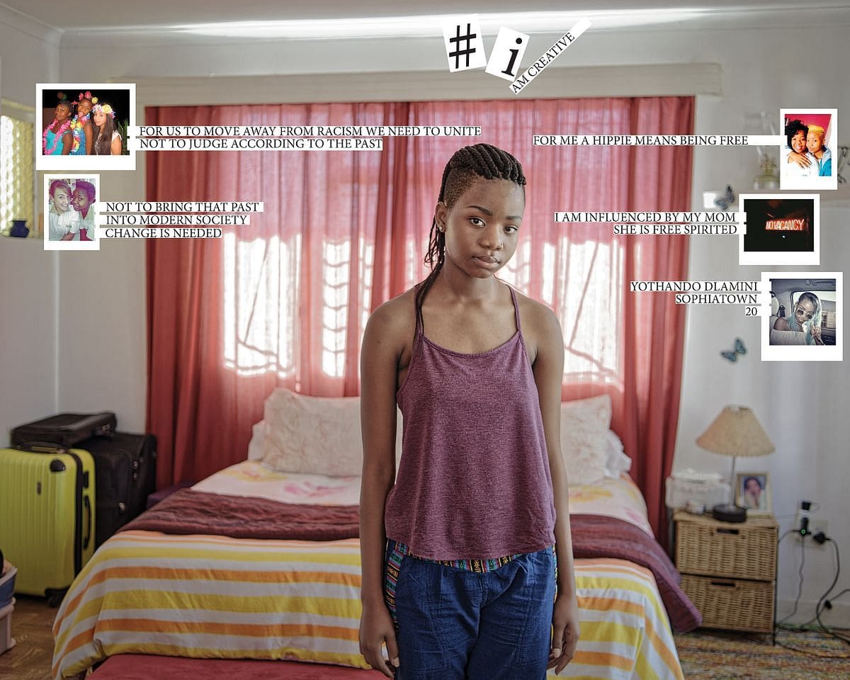 En la serie se retrata la generación de sudafricanos que ha nacido tras el final político del Apartheid de 1994. Los jóvenes que posan delante de su cámara son los protagonistas de los elocuente collages que ha presentado bajo el título de ‘#i’. Cada retrato es combinado en atractivas composiciones formando un collage, por un lado, con fotografías tomadas con los móviles de los protagonistas del proyecto, y por otro, con mensajes donde los jóvenes expresan sus distintas ideas. De este modo, cada protagonista adquiere voz transmitiendo a través de ‘#i’ sus inquietudes, sea la carencia de autoestima, el racismo o el desempleo.