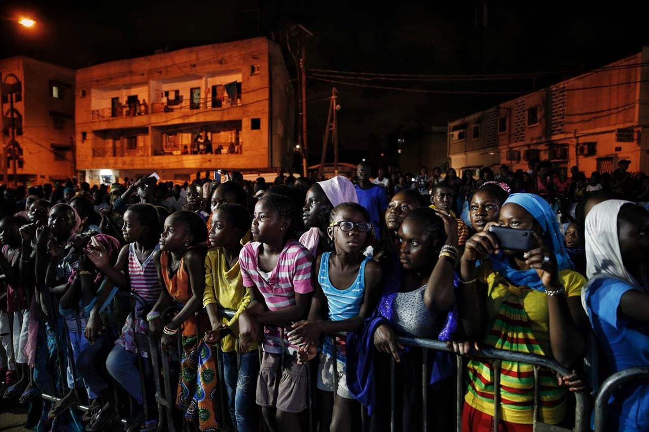 Jóvenes senegalesas ven un desfile durante la Semana de la Moda de Dakar en el barrio Niari Tali de la capital, el jueves 29 de junio de 2017. (AP Foto / Finbarr O’Reilly)