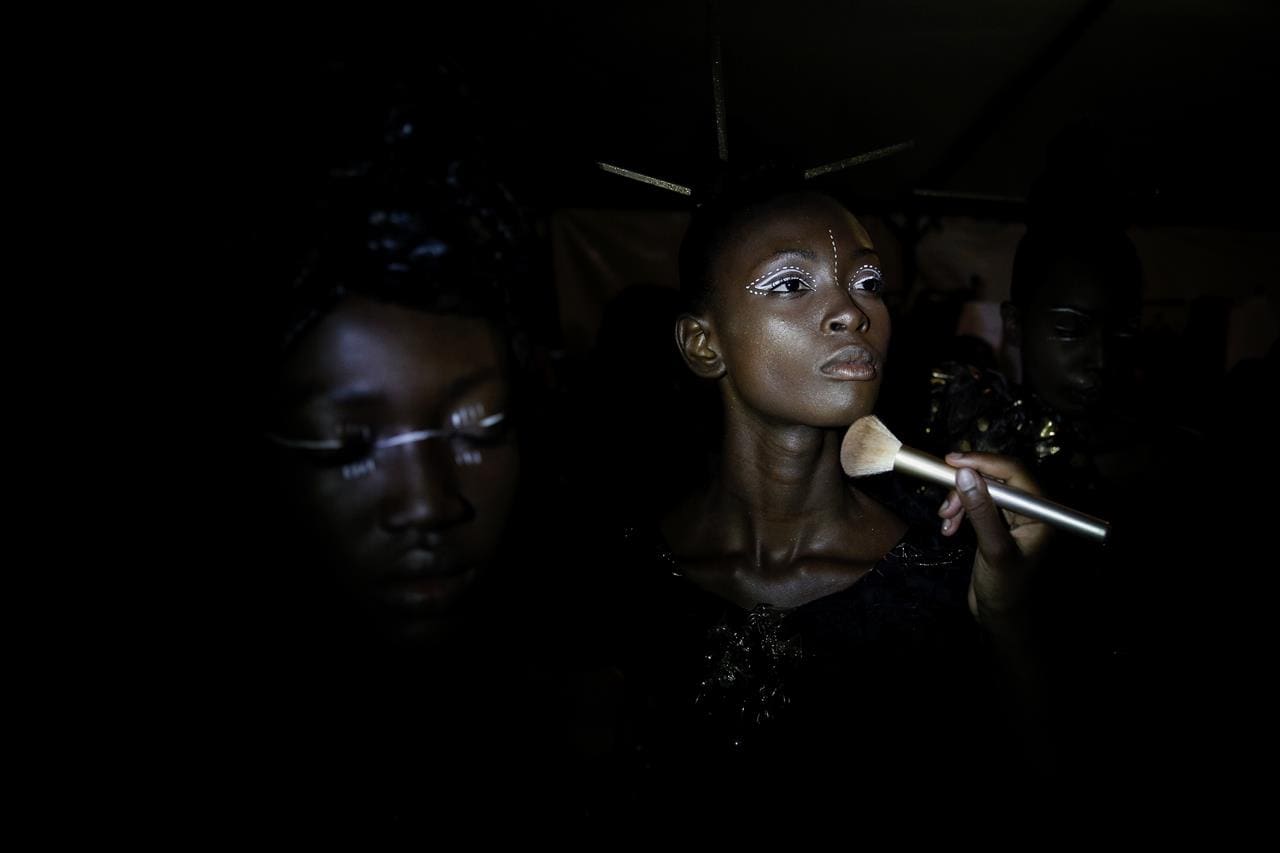 Una modelo en el backstage de la Semana de la Moda de Dakar, el viernes 30 de junio de 2017. (AP Foto / Finbarr O’Reilly)