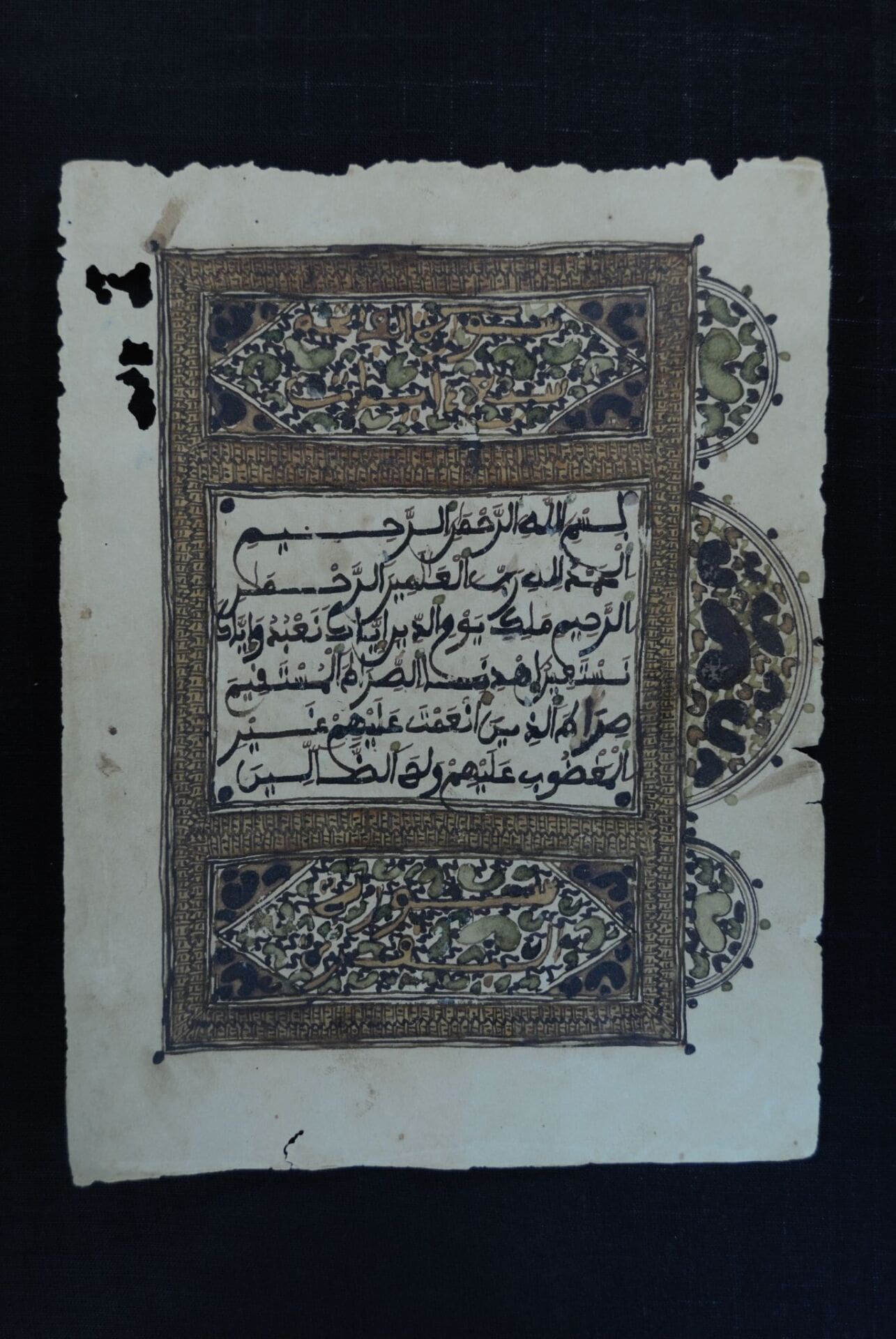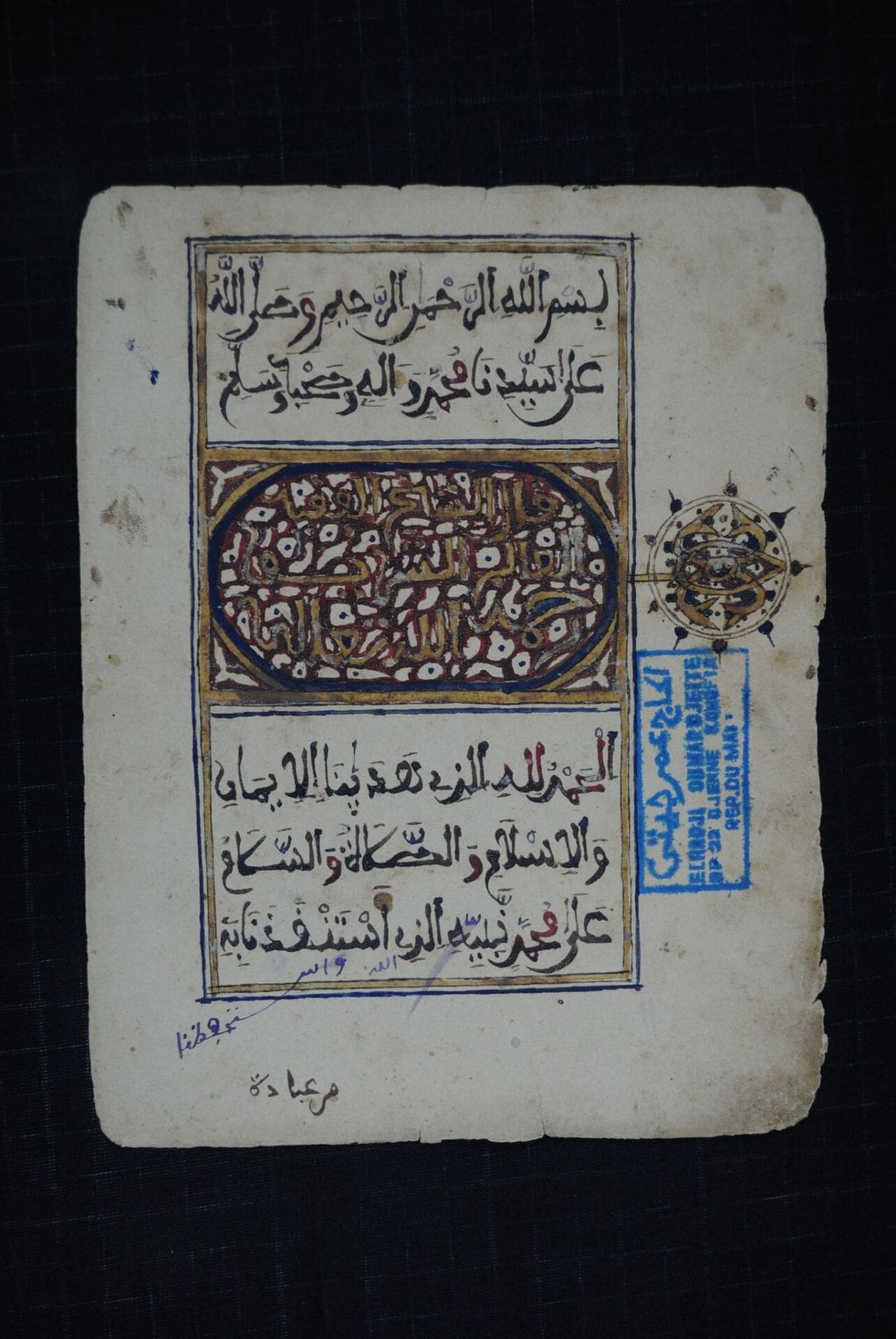 La exposición da pinceladas de la producción local de copias del Corán llenas de ilustraciones y motivos ornamentales como se muestra en uno de los manuscritos que presenta la decoración característica del Surat al-Fatiha, el primer capítulo del libro sagrado. También puede observarse una copia dell poema Dala’il al-Khayrat del imam marroquí al-Jazuli