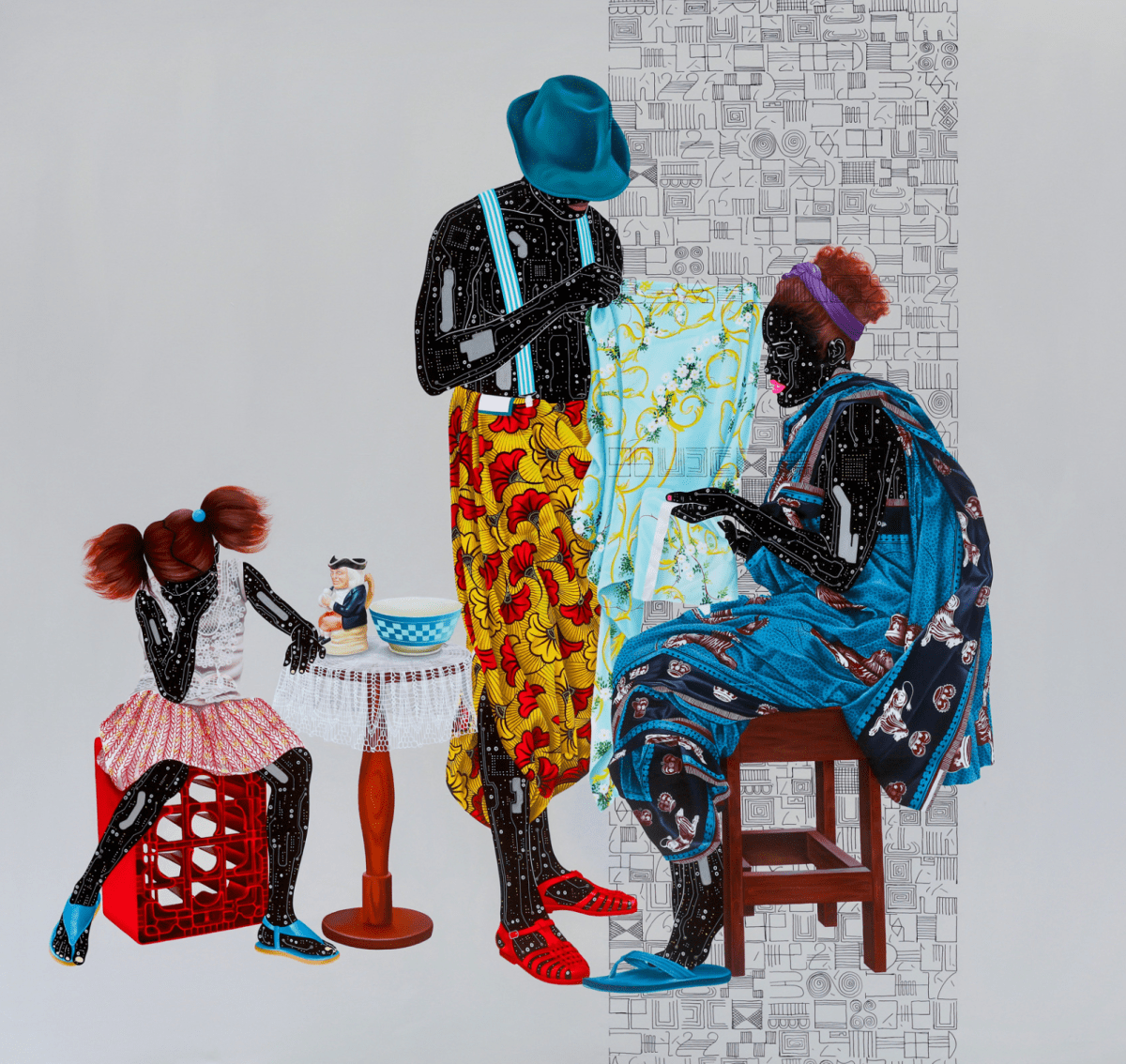 Vasijas de porcelana de la época de los primeros comerciantes portugueses, cuencos de cerámica tradicionales, jarras Toby popularizadas por los ingleses, alguna mesa o silla de estilo clásico y cajas improvisadas como asientos. Es todo el atrezo de ‘Responsabilidad frágil’, la última serie de lienzos en acrílico y óleo de Eddy Kamuanga Ilunga, que, pese a ser escaso, ya contiene más elementos que su creación anterior, dedicada a la etnia Mangbetu.