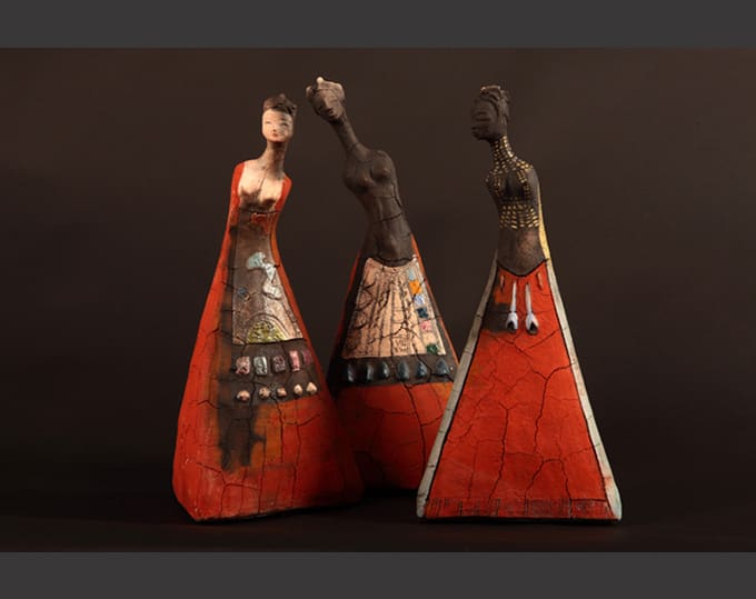 En todo caso, ese aspecto estético puede considerarse, incluso, un rasgo casi superficial del universo artístico de Etiyé Dimma Poulsen. El sustrato africano de la obra de esta escultora va más allá. Esa base se oculta en lo más sustancial de su producción, en la propia concepción. Por un lado, el poder creador que la artista confía a los elementos básicos, la tierra y el fuego. Las palabras de Etiyé ponen de manifiesto su fascinación por la cerámica con la que construye sus figuras. Y, sobre todo, la importancia que confiere al fuego en sus obras. De su explicación se extrae que casi considera el fuego un coautor de sus esculturas. “Siempre es un descubrimiento para mí el momento en el que mis personajes sale del horno. Nunca sé cómo saldrán. El fuego es un elemento creador que modela mis esculturas dotándoles de vida”. Y llega incluso a afirmas que “el fuego es como un mentor que corrige los defectos de mis esculturas y borra los rasgos inútiles que yo puedo darles”.