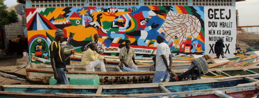 Fue justo este objetivo el que se experimentó hace una semana. A diferencia de otros festivales, aunque fuera éste el último día, no era una clausura. El arte perdura, y prueba de ello fue la visita guiada (un animado paseo) a los distintos murales que se han ido haciendo desde los inicios del proyecto en 2008. Sus coordinadores, Aïcha Touré y Mame Cheikh, acompañado por el director del Agregado Cultural de la Embajada española en Dakar, Ignacio Garrido, así como distintos miembros de Cultura Dakar, principal colaborador del festival junto con la compañía aérea Binter y otros curiosos y amantes del arte, se dieron cita en Soumbedioune, para visitar cada una de las obras. Entre las pirogues, barcas de pescadores, se congregaban los amigos del festival, mientras los pescadores agradecían a los artistas el trabajo: «De verdad, no sabéis la alegría que nos va a dar salir a pescar, mirar hacia acá y ver todos estos colores. Es muy bonito, muchísimas gracias».