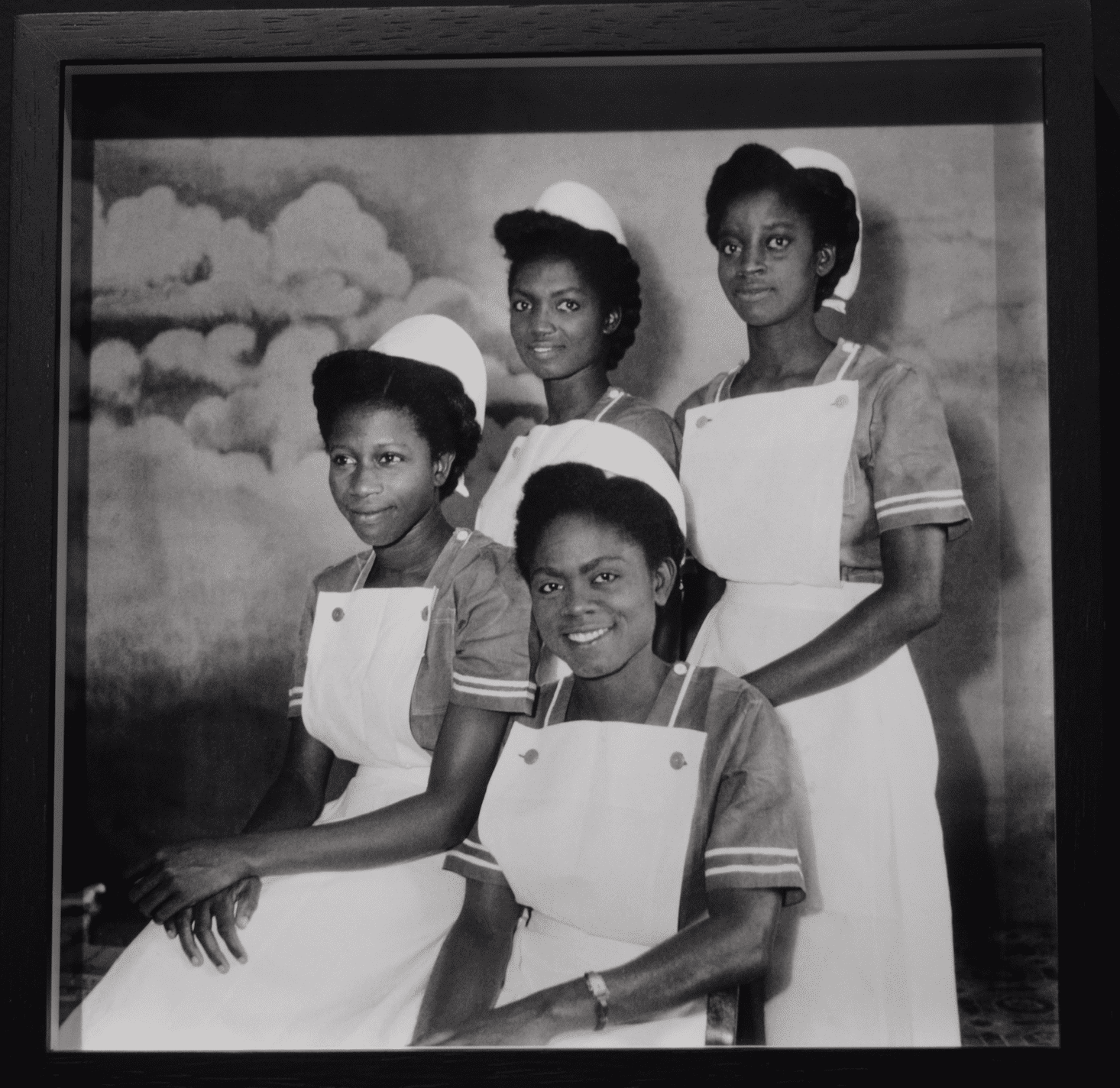 Unas enfermeras diplomadas del Hospital Universitario Korle Bu en la capital ghanesa, una reina del baile o un joven matrimonio con su testigo. Así son las primeras capturas de Barnor, que se inició en el mundo de la fotografía a los 18 años. Se trata de escenas íntimas envueltas en una naturalidad y una sencillez clarificadoras, retratos que salen del interior de un estudio y de las casas, para hacerse al aire libre. De hecho, no tuvo más remedio que realizar sus trabajos en la calle, puesto que la veranda de su casa se le quedó pequeña.