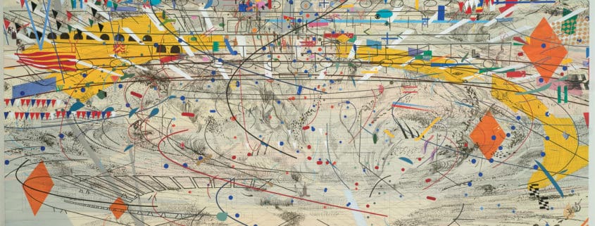 El color tiene también cabida en los lienzos de Julie Mehretu. Se dispone en definidos bloques que flotan equilibradamente por el espacio, atrayendo nuestra atención con sus tonos planos de gran vivacidad. El cromatismo más intenso se da en pinturas como “Mumbo Jumbo” (2008) o “Zero Canyon (A Dissimulation)” (2006), obras de enorme atractivo visual, que dan paso a otras en las que el color irá perdiendo protagonismo y intensidad.