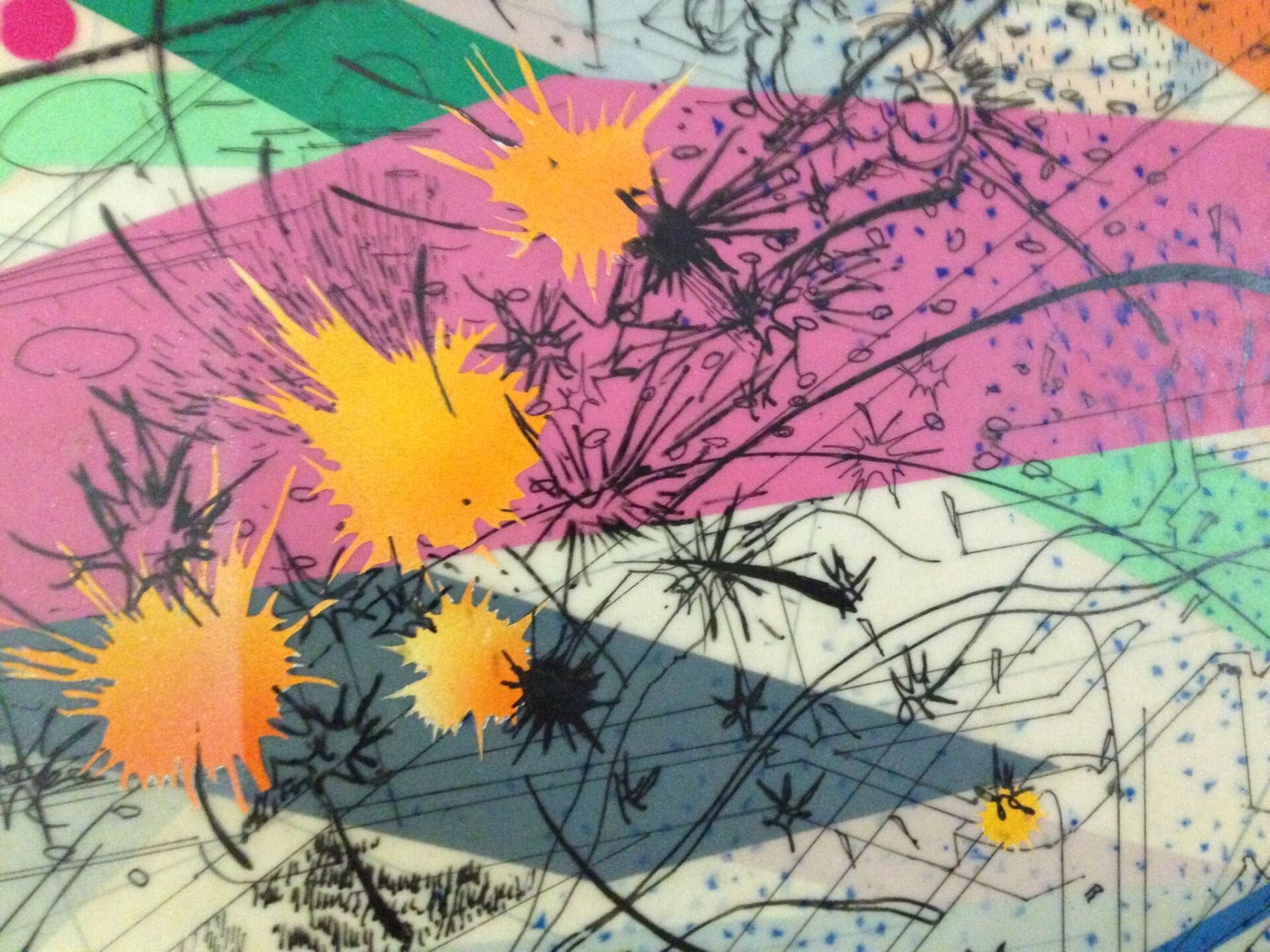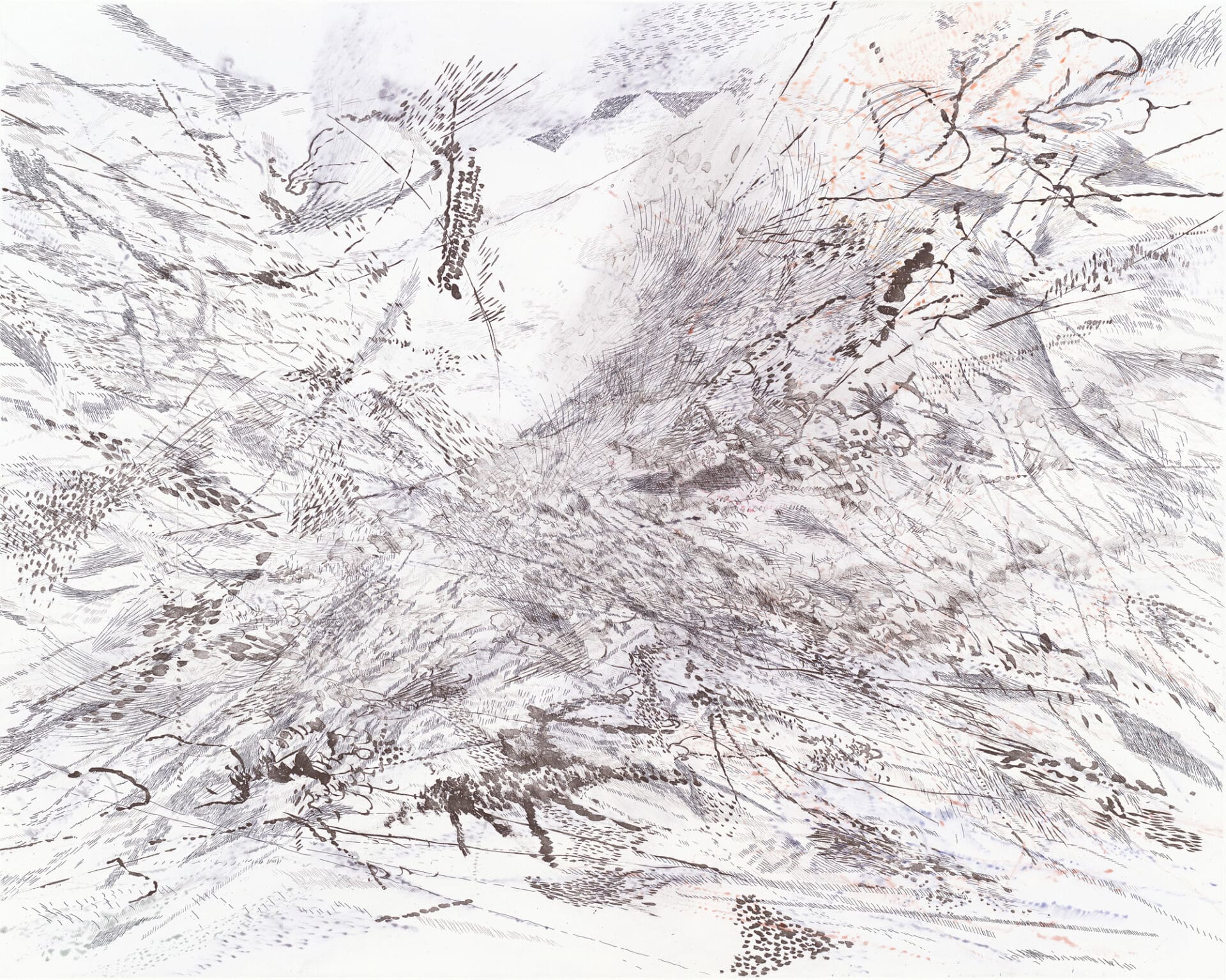 Con la siguiente capa entra en juego la dicotomía entre línea y mancha. Contrastando con la composición geométrica de la planimetría inicial, encontramos una explosión dinámica. Rectas, curvas e incluso manchas pueblan el lienzo con aparente espontaneidad expresiva. El resultado son imágenes polisémicas de carácter abstracto, donde el movimiento tiene un papel protagonista. Flujos migratorios, conflictos sociales o diferentes coyunturas económicos se materializan sobre la tela. Como se puede apreciar en “Fragment” (2009), donde generan una caótica nebulosa con cierta armonía interna en la que uno puede jugar a reconocer elementos, desde aves en vuelo a olas chocando en tempestad.