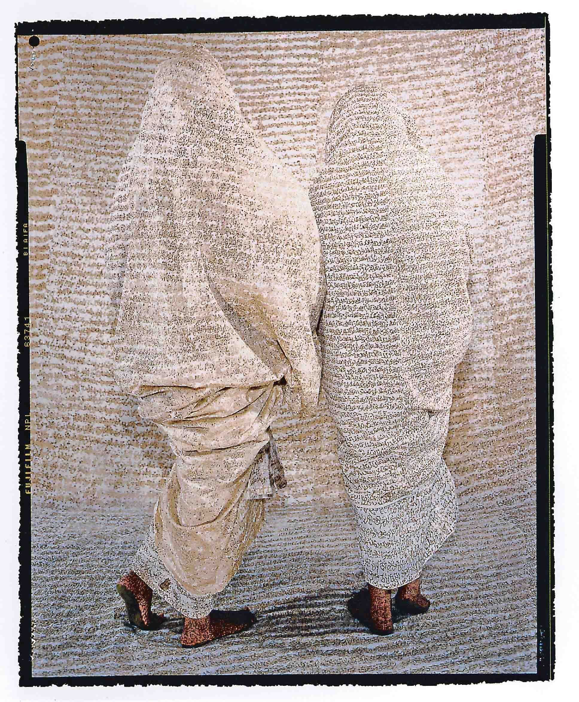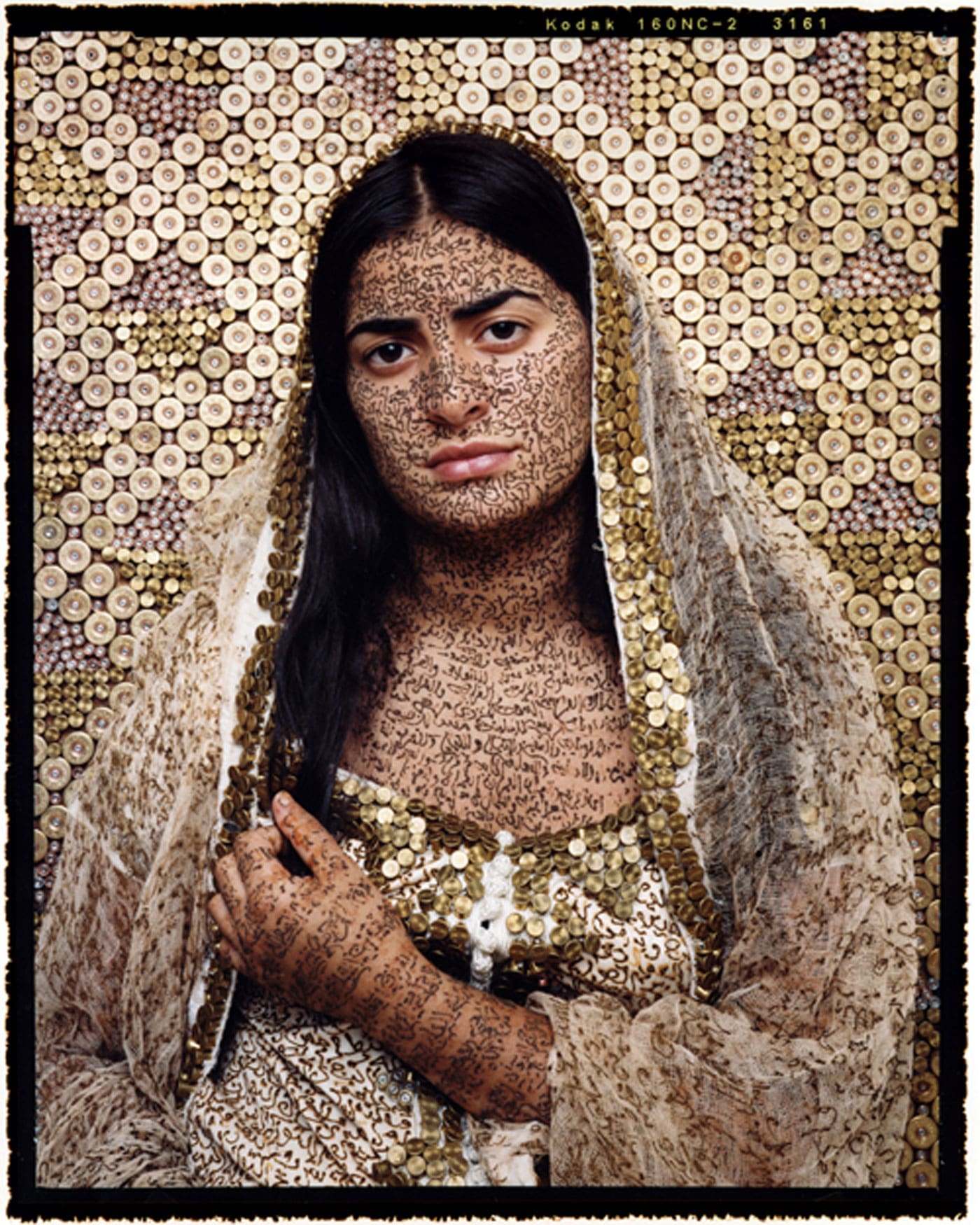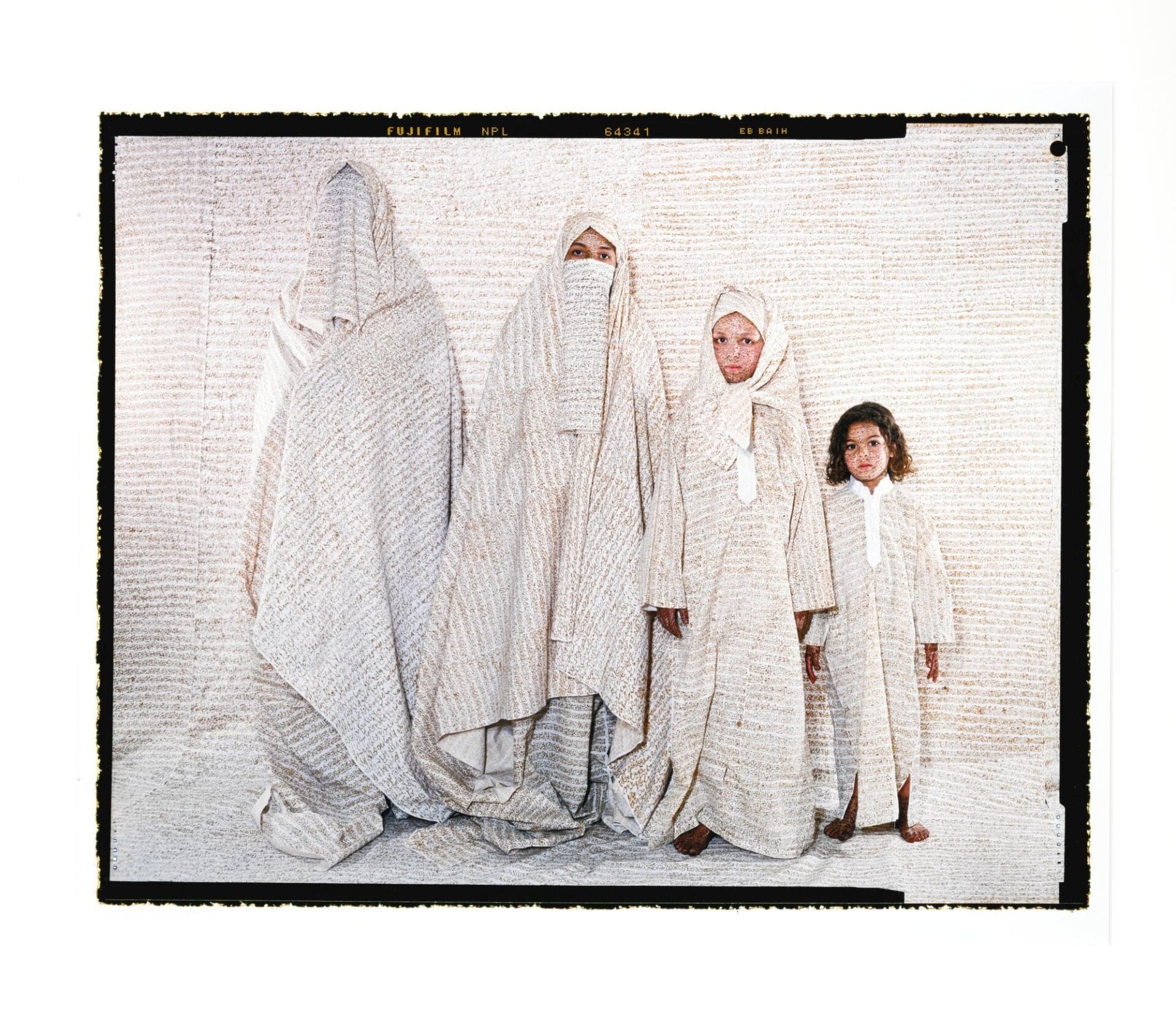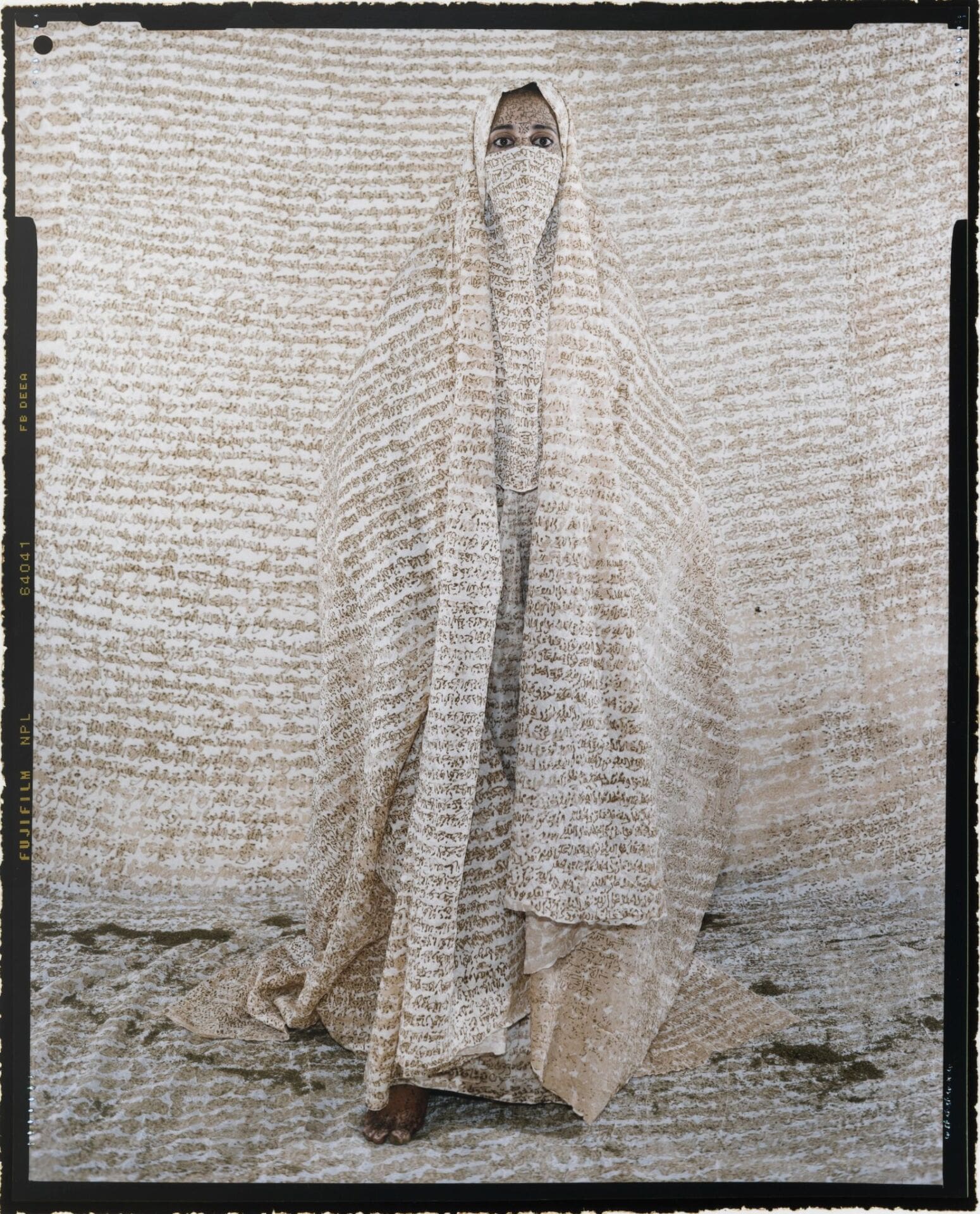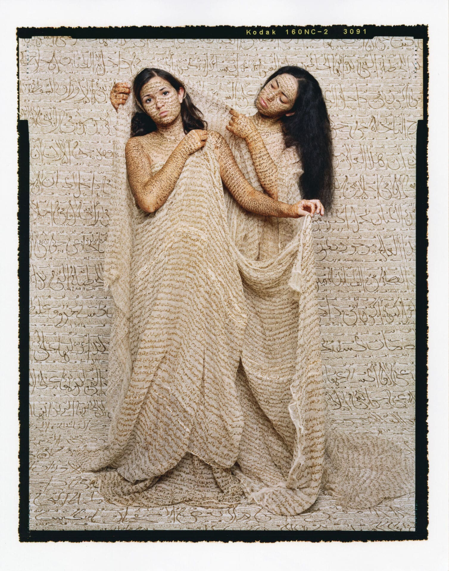 Los textos en árabe que rodean el rostro y el cuerpo de las mujeres protagonistas de las obras de Lalla Essaydi aparecen siempre en un estilo abstracto y poético, ininteligible incluso, confiriéndole a sus piezas “una universalidad que va más allá de las fronteras culturales”, tal y como ella misma señala. La autora, nacida en Marrakech, no recibió formación en arte caligráfico, algo habitual entre las mujeres de su país y, por eso, nos confiesa, ha terminado desarrollando su propio método: escritura a través de henna aplicada con una jeringa.
