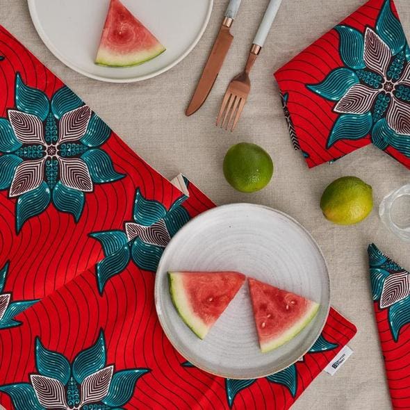 Lámparas, cojines, edredones y menaje de cocina hechos a mano con telas procedentes de África Occidental. Detrás de esta tienda inglesa está Natalie Manima, de ascendencia ghanesa. Su trabajo como terapeuta cognitivo conductual le mostró la importancia de un entorno cálido y alegre, de ahí los coloridos estampados que caracterizan a su marca.
