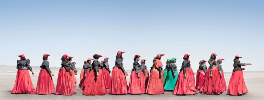 Voluminosos y pomposos vestidos cargados de enaguas abruman la vista sobre el caluroso paisaje namibio. Su corte victoriano no es casual y sigue presente en el vestuario de las mujeres herero más de un siglo después de que llegara a estas tierras con las primeras familias alemanas. Aunque hoy sigue siendo vestuario habitual de algunas mujeres de esta etnia, tal y como muestra el fotógrafo británico Jim Naughten en su libro Conflict and Costume (Merrell, 2013), se trata principalmente de un atuendo de gala usado en las ocasiones especiales. Así, es el traje que suele llevarse a las bodas y la indumentaria que viste las calles en el desfile de la fiesta anual herero celebrada el 11 de agosto, Día de Samuel Maharero, el jefe herero que guio a través del desierto a los supervivientes de las matanzas coloniales hasta Botswana en 1904.