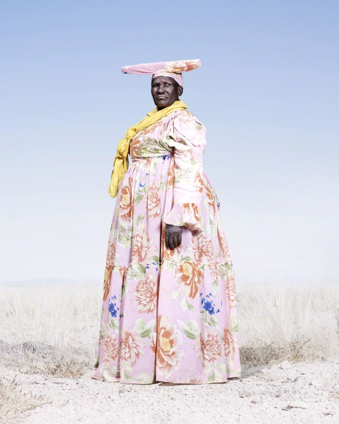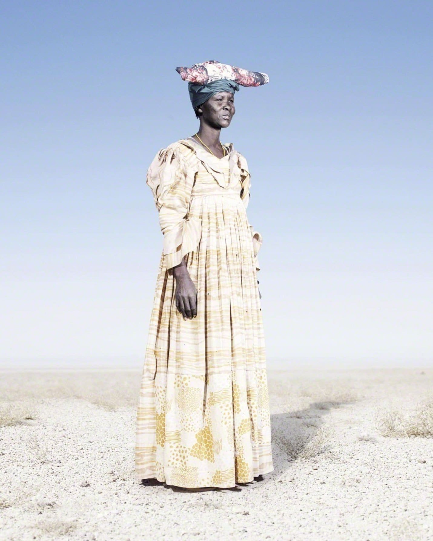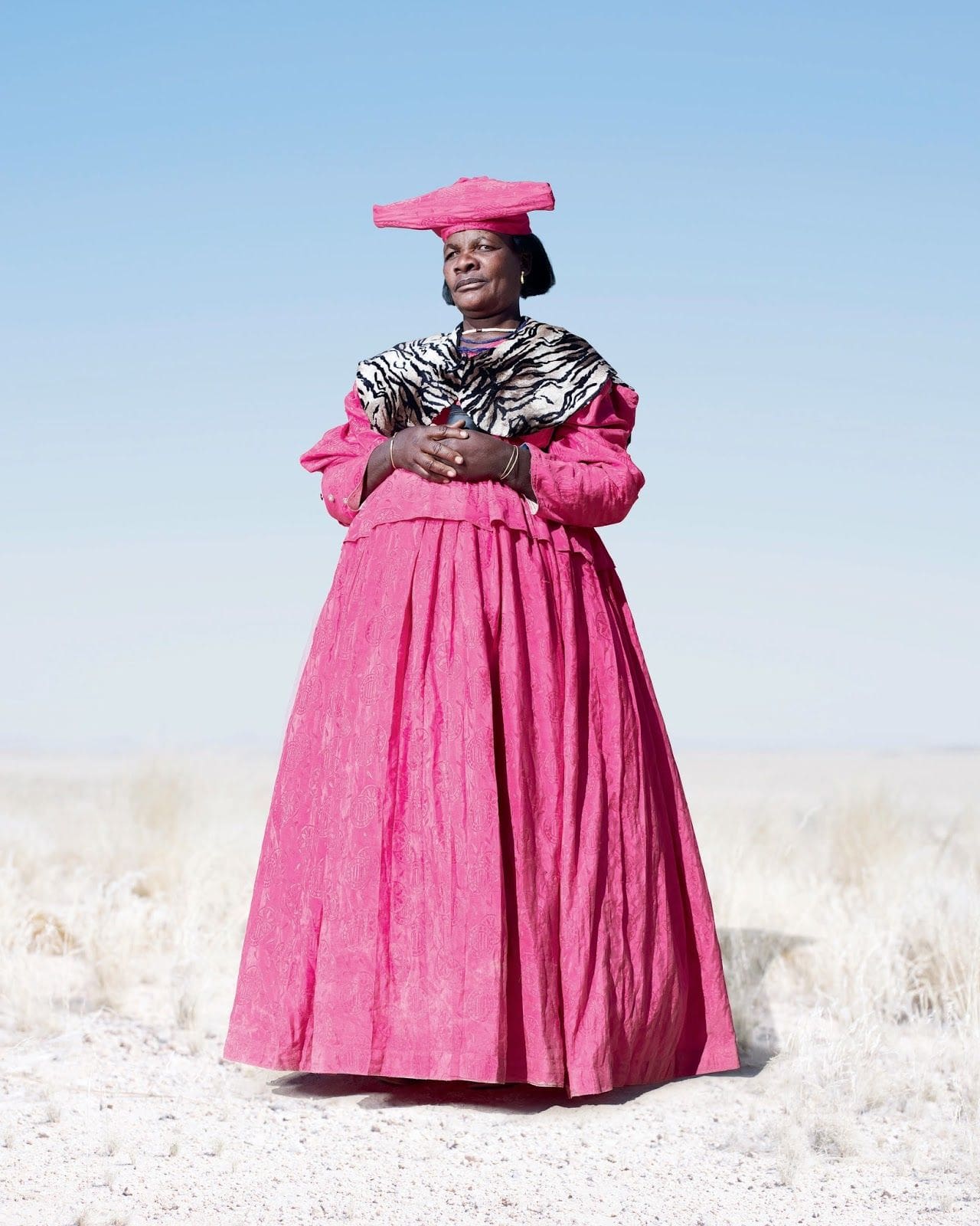 Voluminosos y pomposos vestidos cargados de enaguas abruman la vista sobre el caluroso paisaje namibio. Su corte victoriano no es casual y sigue presente en el vestuario de las mujeres herero más de un siglo después de que llegara a estas tierras con las primeras familias alemanas. Aunque hoy sigue siendo vestuario habitual de algunas mujeres de esta etnia, tal y como muestra el fotógrafo británico Jim Naughten en su libro Conflict and Costume (Merrell, 2013), se trata principalmente de un atuendo de gala usado en las ocasiones especiales. Así, es el traje que suele llevarse a las bodas y la indumentaria que viste las calles en el desfile de la fiesta anual herero celebrada el 11 de agosto, Día de Samuel Maharero, el jefe herero que guio a través del desierto a los supervivientes de las matanzas coloniales hasta Botswana en 1904.