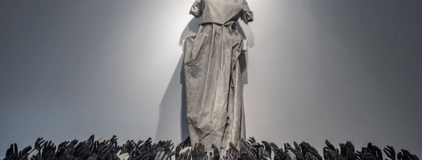 Las manos son un motivo recurrente en esta retrospectiva. Las hay blancas, negras y hasta de oro, en el caso de la desasosegante escultura humana, totalmente cubierta y postrada cara al suelo. Las manos como elemento importante pero no por su color, sino por lo que se hace con ellas, ya sea dar cobijo a jugosas frutas, o jugar inocentemente como el niño de ‘Man of war’, duro interrogante sobre el origen de la violencia humana.