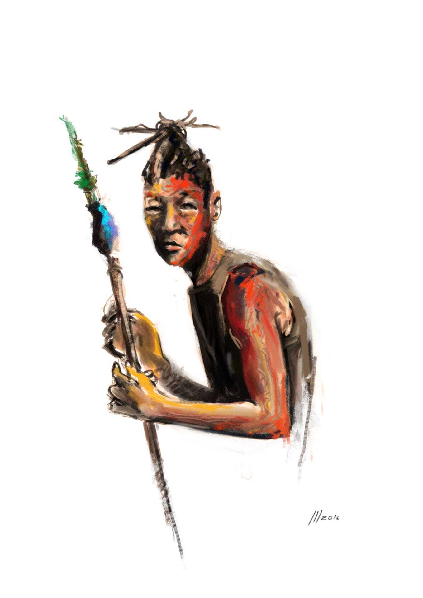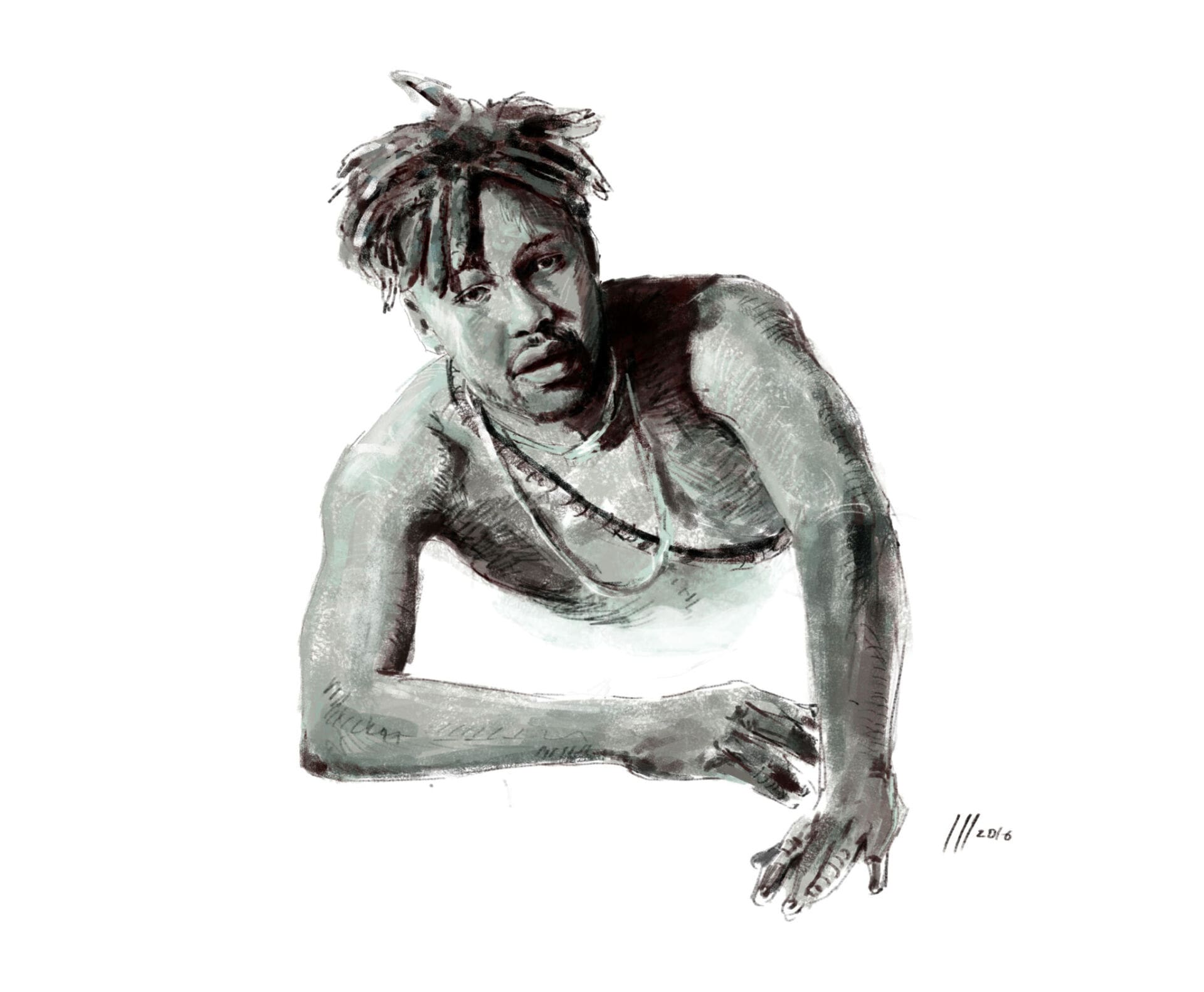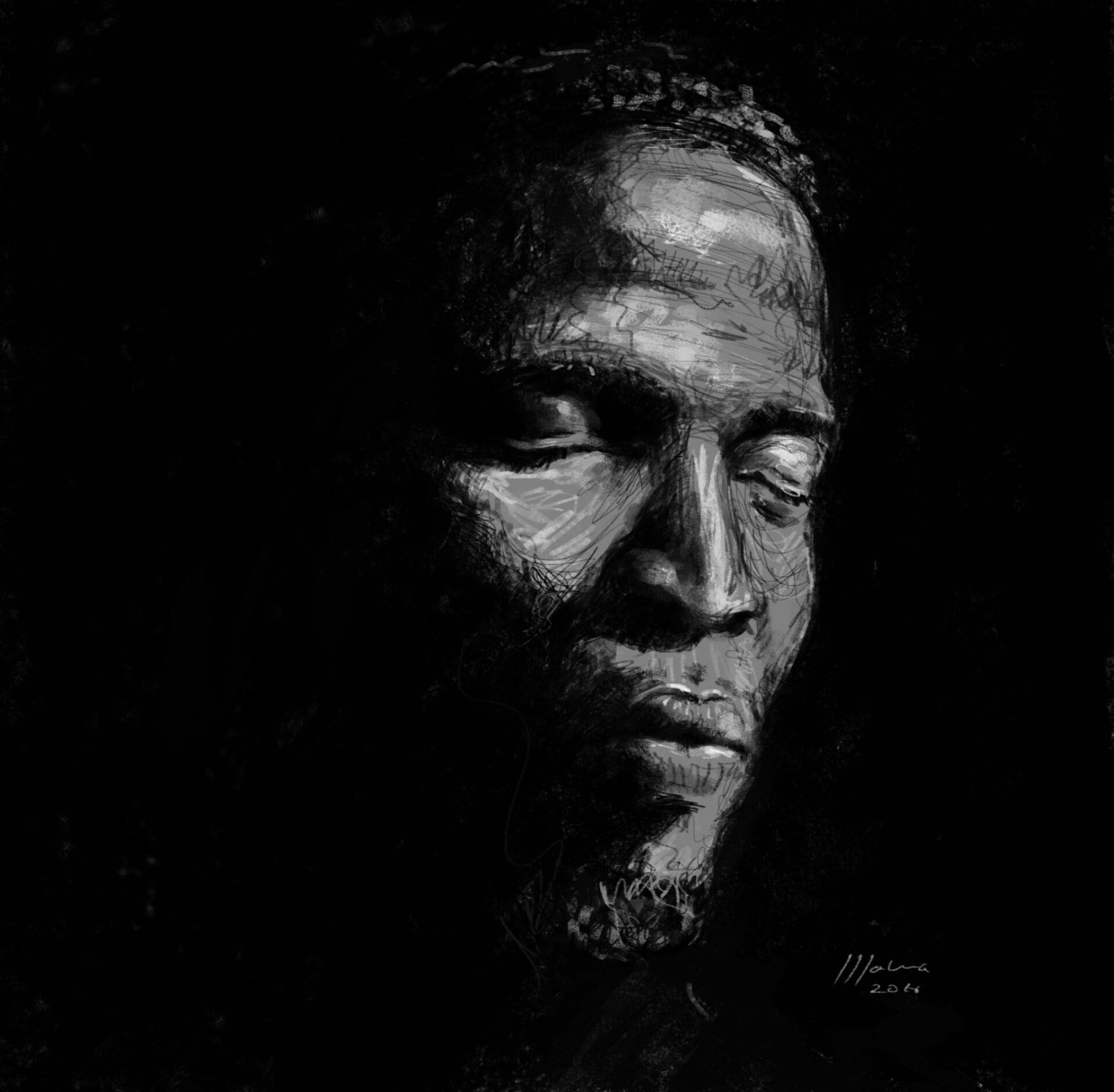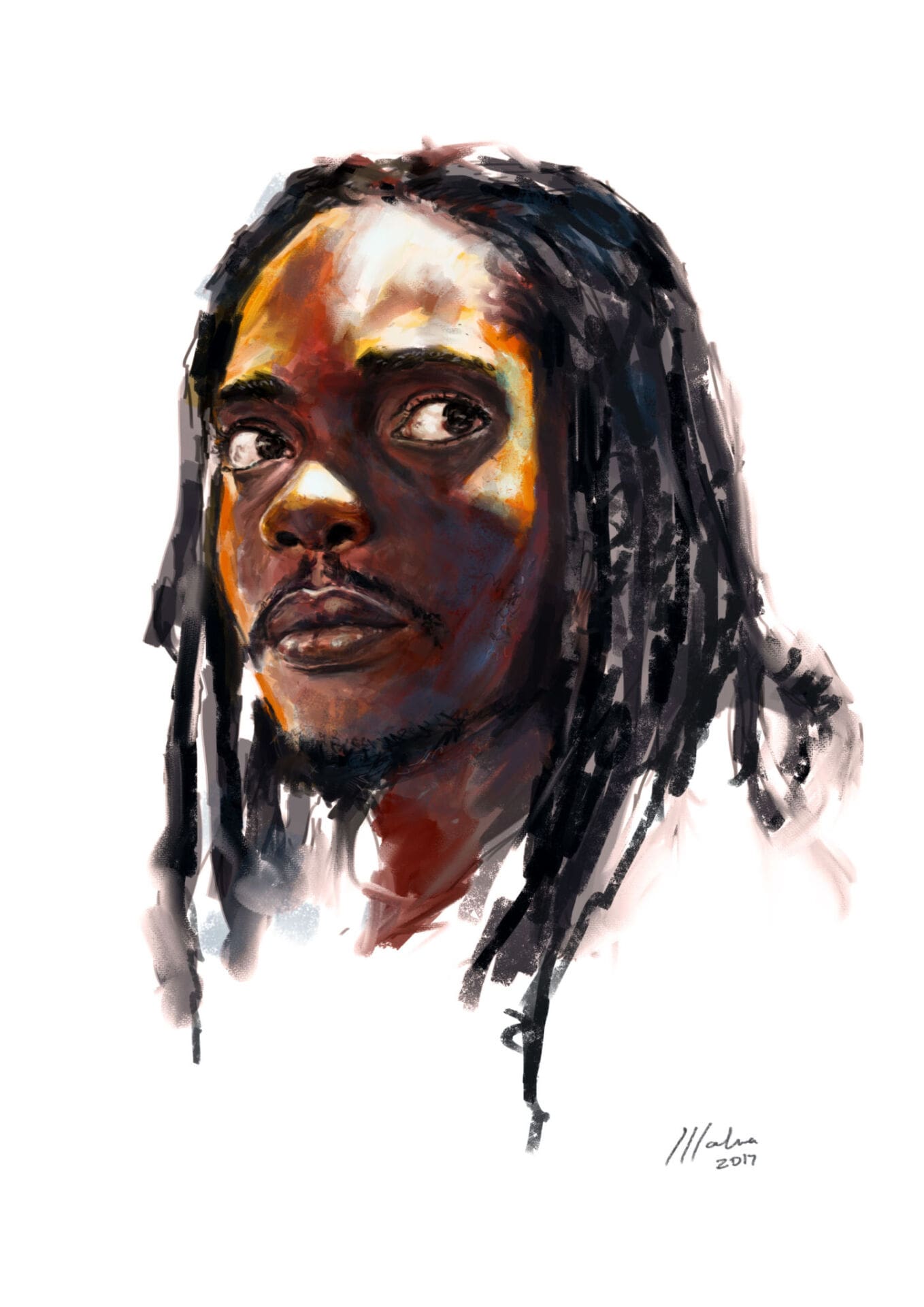 Como estudiante de Bellas Artes dice que se sentía diferente de sus compañeros, que demostraban una interminable paciencia perfeccionando sus piezas. Así fue como en 2012 comenzó a flirtear con el arte digital, al que dice estar tremendamente agradecido por permitirle corregir y retocar con mayor facilidad. Aunque sus pinceladas sugieren un lienzo tradicional y de caballete, el joven ilustrador crea su obra en Adobe Photoshop mediante una tablet. Igual de moderna es su elección de galería, que no es otra que su muro de Facebook. Su nombre empieza a sonar hace unos años, cuando a Malua se le ocurre realizar y difundir a través las redes sociales retratos de personajes de la esfera artística namibia y de otros puntos de África.