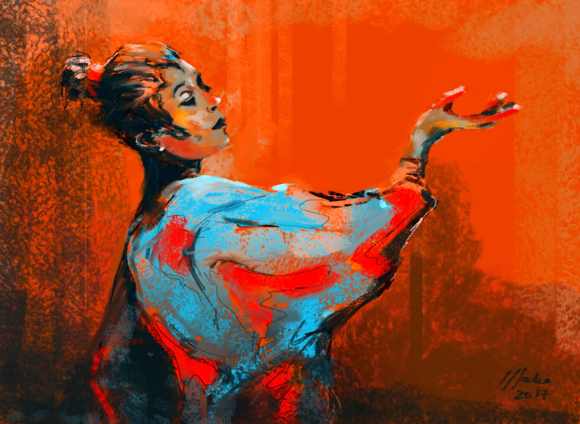 Mi proceso de creación implica en gran medida la autoexpresión. Intento profundizar en la expresión de los sentimientos, aunque no necesariamente de mis propios sentimientos, a menudo algo más, como el sentimiento de la personalidad de otra persona, la raza, la nación de uno o de toda la humanidad. Prefiero crear cuando el espacio y el estado de ánimo son extraños y poco convencionales: me gusta buscar el orden en el caos, ya que parece que eso genera una mayor inspiración en mí. Intento alejar mis pensamientos cuando estoy creando y no darle importancia a los tecnicismos ni a las reglas. Comienzo con trazos aparentemente sin sentido durante tres o cuatro minutos y diez o quince minutos más tarde me gusta volver a esas líneas e intuir las conexiones, ver lo que puedo crear a partir de ellas. Siempre surge algo nuevo.