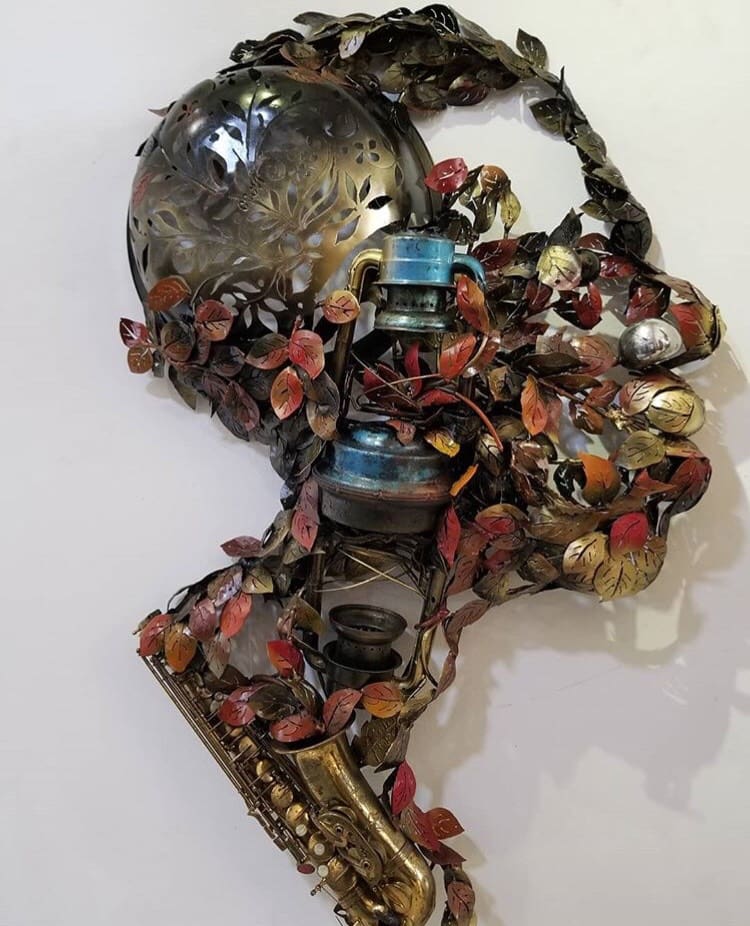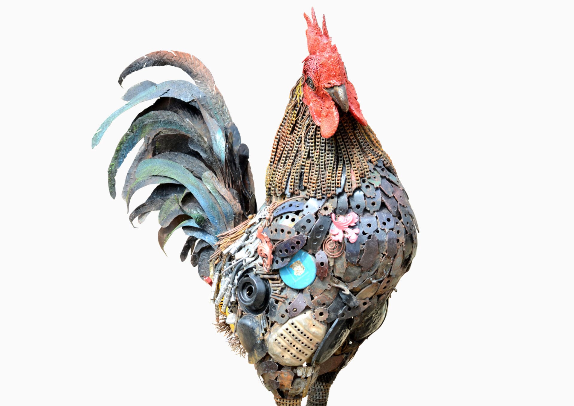 Su arte es integrador y diverso. Vemos obras con detalles capitalistas, como el resto de un escudo de la marca Mercedes y elementos más tradicionales, como la abundante fundición del bronce, una práctica artística habitual entre los pueblos de Bini, o guiños a la cultura yoruba. En cualquier caso, todos estos materiales han pasado por las manos de personas que una vez exprimido su uso determinaron deshacerse de ellos, y esa utilidad que le dieron, su calidad o sus propiedades son capaces de desvelar muchos secretos sobre su antiguo propietario, como su condición sociocultural, económica o política o incluso sus anhelos. “Estos objetos reflejan indirectamente las condiciones de vida del pueblo nigeriano”, asegura el escultor.