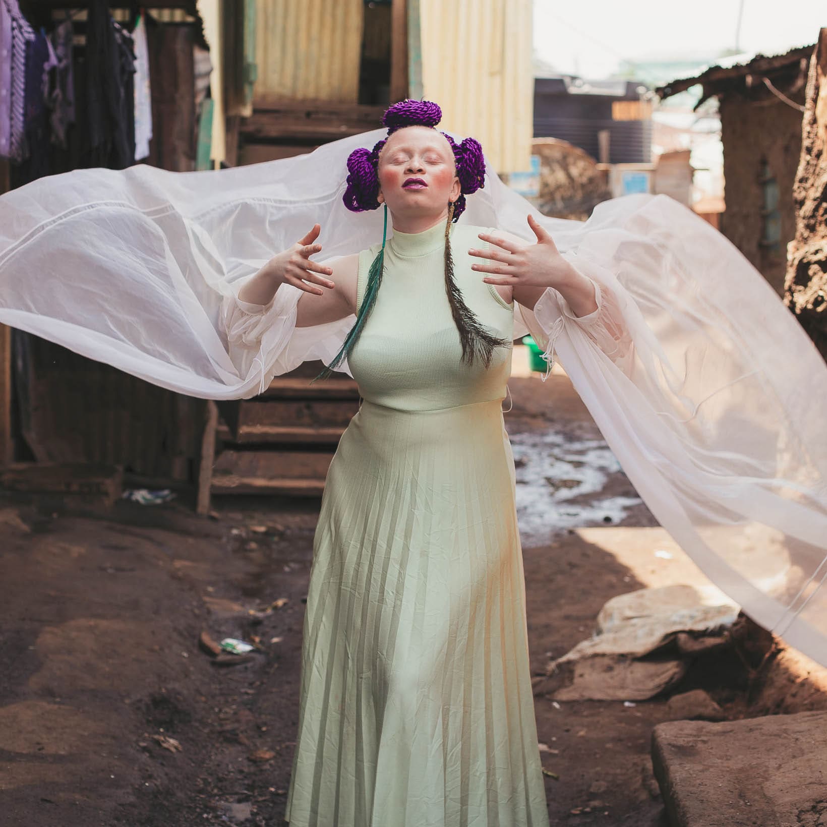 Es el caso de ‘Extraño en una tierra conocida’, probablemente su obra más popular, en la que retrata a la activista Florence Kisombe en el barrio marginal de Kibera, en la capital keniana. Tanto Kisombe como el protagonista de su serie posterior ‘Todavía un extraño’ son personas con albinismo. Ambos trabajos, relata Waiswa, “fueron creados como una respuesta al tratamiento que reciben las personas con albinismo en algunas partes de África Subsahariana. Quería crear conciencia acerca de ello, pero también transmitir la sensación de soledad y aislamiento de la marginación”. Si bien en ‘Todavía un extraño’ la fotógrafa cambia de escenario, en ‘Ballet en Kibera’ vuelve al suburbio de Nairobi para mostrar, junto a su colega Fredrik Lerneryd, los ensayos y actuaciones del ballet de Anno’s Africa y One Fine Day. “Quería proporcionar una imagen alternativa al estereotipo monolítico del niño en un asentamiento informal”, comenta.