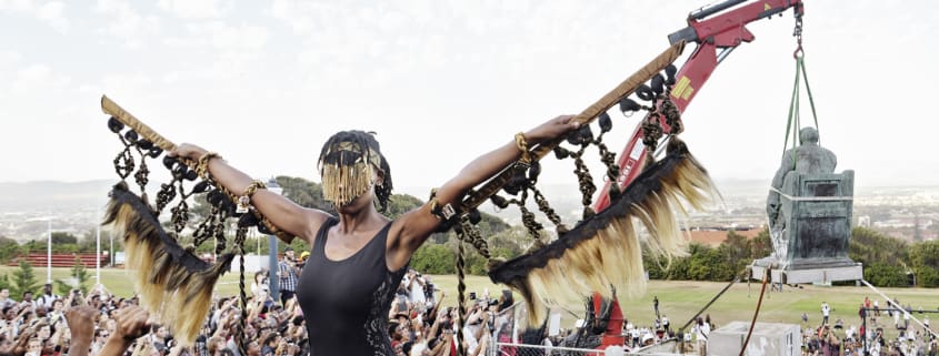 Ella llevaba días soñando con un pájaro y quiso evocarlo. Así dio forma a Chapungu, un ave procedente de Zimbabue representada en una piedra tallada de alto valor espiritual que fue saqueada a finales del siglo XIX y que todavía se encuentra en la casa de Rhodes en Ciudad del Cabo. Ataviada con unas alas compuestas por cabellos, una malla negra y subida a unos tacones de aguja con su rostro cubierto por un velo de cuentas, Sethembile Msezane estuvo durante cuatro horas sobre un pedestal de espaldas a la estatua de Rodhes y expandió las alas de Chapungu en el momento justo en el que la grúa arrancó el monumento.