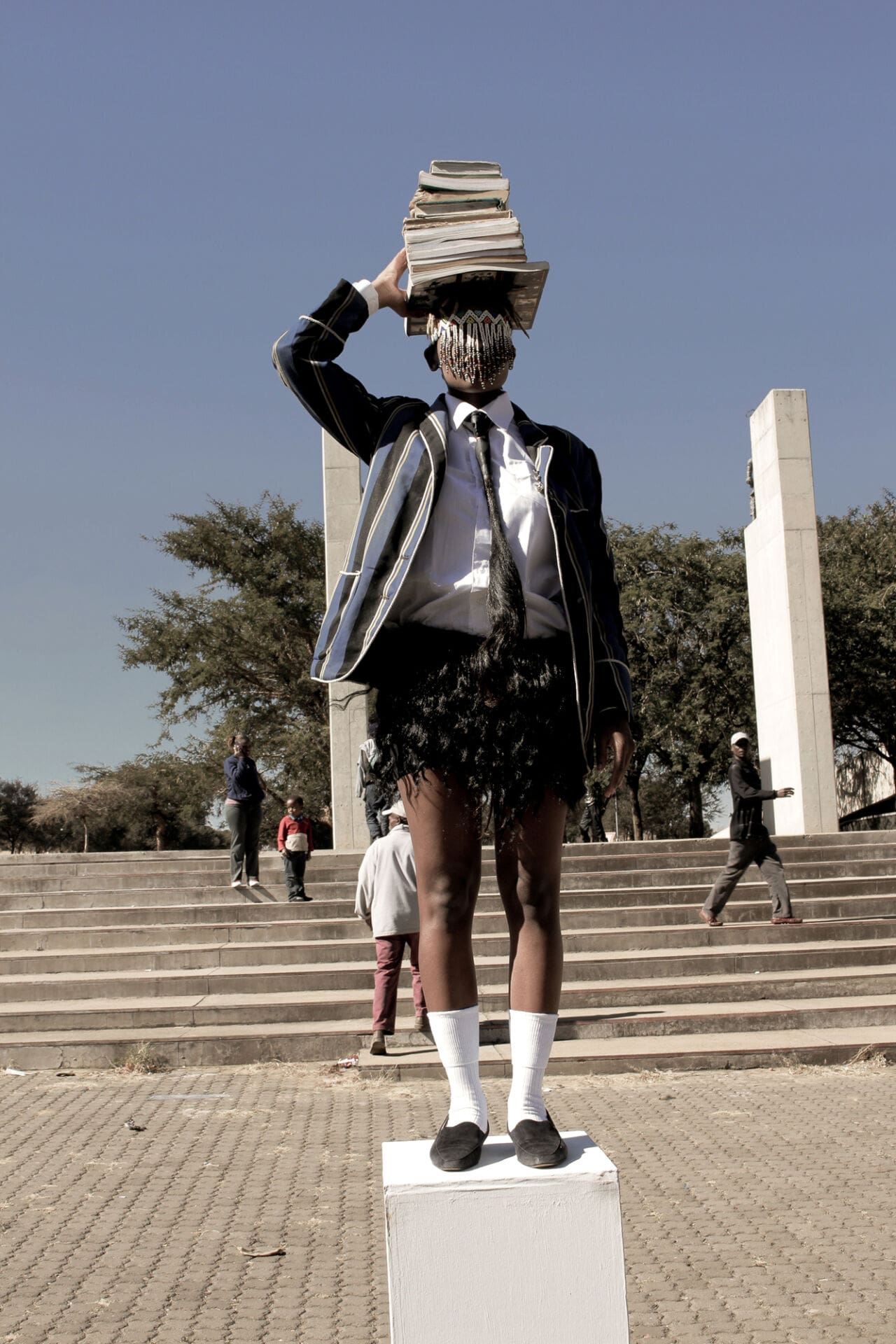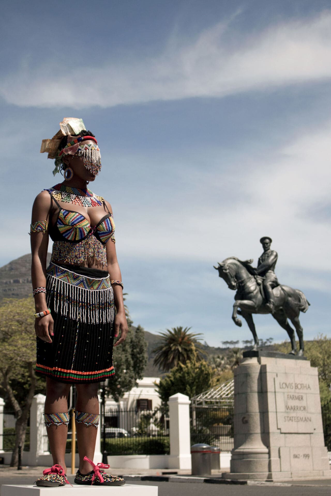 “Los marcadores en el paisaje son un indicador y una representación visual de la historia de un lugar o de su gente. Estos marcadores aparecen en forma de monumentos, estatuas, placas, arquitectura y demás. En algunos casos, estos monumentos, estatuas, etcétera, no representan la historia y no muestran la existencia de todos los grupos sociales, lo que dificulta la representación de determinadas identidades colectivas borrándolas como realidad. Esto daña a cualquier nación en sus perspectivas de construirse como tal”, explica Sethembile Msezane.