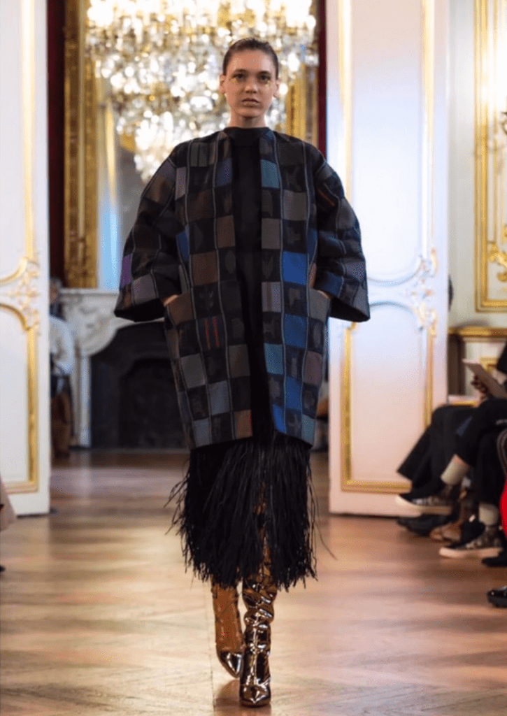 - Abrigo diseñado por Imane Ayissi realizado con tejidos Kente de Ghana, algodón, raso y Fia de Madagascar – Fotografía de Fabrice Malard