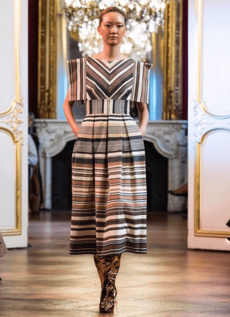 - Vestido diseñado por Imane Ayissi realizado con algodón orgánico y tejido Faso dan Fani de Burkina Faso – Fotografía de Fabrice Malard