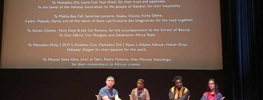 De izquierda a derecha, J. Carlos Vázquez Velasque, director del Festival Internacional de Cine Invisible ‘Film Sozialak’ de Bilbao y de la ONGD Kultura Communication Desarrollo; Adia Mboup, Directora de la radio comunitaria Gëm Suñu Bopp FM de Gandiol (Senegal); y Mamadou Dia y Laura Feal, protagonistas del documental Doxandem, los cazadores de sueños, durante la proyección en el Auditorio del Museo Guggenheim el 22 de octubre. Fotografía de Estrella Sendra.