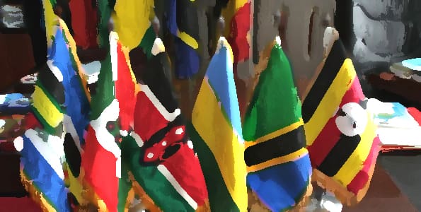 Banderas de los cinco países que integran la Comunidad de África del Este, más la bandera de la institución.