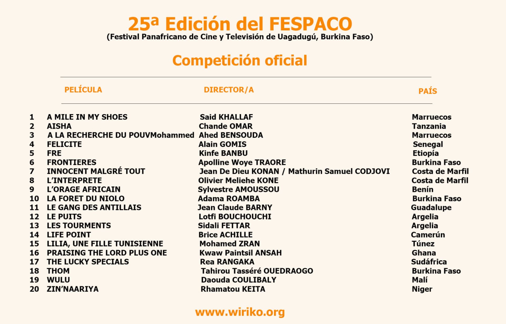 En total, 164 películas compiten en varias secciones, incluyendo los 20 largometrajes de 15 países que optarán por el Étalon de Yennenga (Semental de oro), en su mayoría películas en francés, 4 de habla inglesa y ninguna en portugués. Cabe destacar el retorno de Níger, Camerún y Tanzania al prestigioso concurso al mismo tiempo que mencionar la gran ausente de esta edición: Nigeria. En la rueda de prensa que tuvo lugar en enero en París se comentó que los cineastas nigerianos se habían centrado en la rentabilidad de la producción a expensas de lo artístico. No obstante, la muestra que desde hace algunos años ofrece el festival Nollywoodweek en París –del que Wiriko es medio oficial– continúa defendiendo que no todo lo que se hace en Nollywood es de poca calidad.