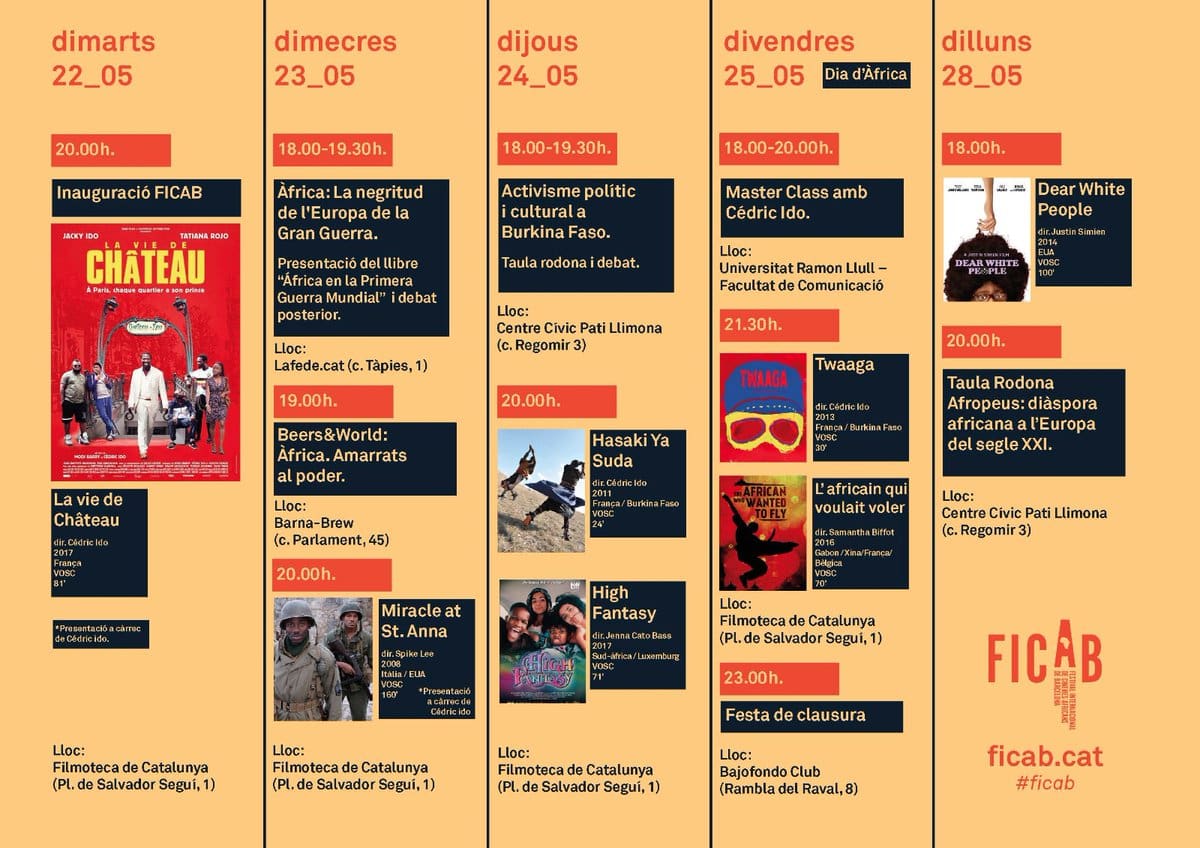 El FICAB, que nace con vocación de convertirse en un espacio permanente de cooperación cultural y académica entre entidades y asociaciones del Norte y el Sur, se celebrará del 22 al 28 de mayo de 2018 en diferentes espacios de la ciudad. El epicentro de las proyecciones será en la Filmoteca de Catalunya con el ciclo «Diáspora e Identidad» y tendrá como invitado especial al franco-burkinés Cédric Ido. Además, las actividades paralelas se cumplimentarán en LaFede, el Centro Cívico Pati Llimona, la Facultad de Comunicación y Relaciones Internacionales de la Blanquera y el centro cultural Inusual Project.
