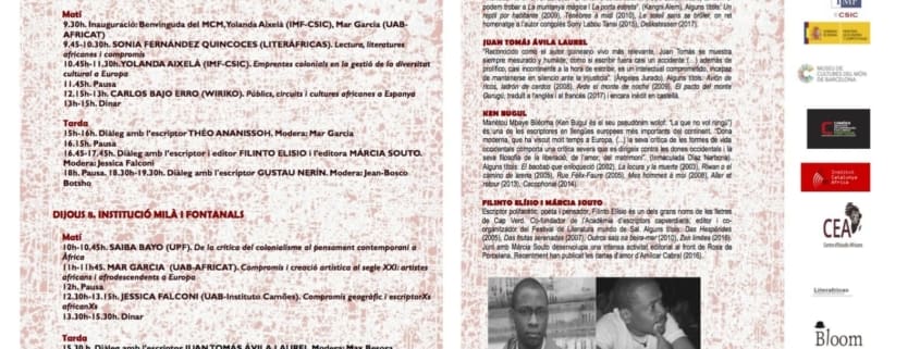 El togolés Théo Anannisoh, el ecuatoguineano Juan Tomás Ávila Laurel, la senegalesa Ken Bugul y los caboverdianos Filinto Elisio y Márcia Souto, son los y las protagonistas de excepción de la segunda edición de las Jornades de l’Escriptorx Africax que organiza en Barcelona, Africat y la Institució Milà i Fontanals, dentro del proyecto De Puny i Lletra. La cita es el miércoles 7 de noviembre y el jueves 8 en el Museu de les Cultures del Mon y en la Institució Milà i Fontanals de la capital catalana, respectivamente.