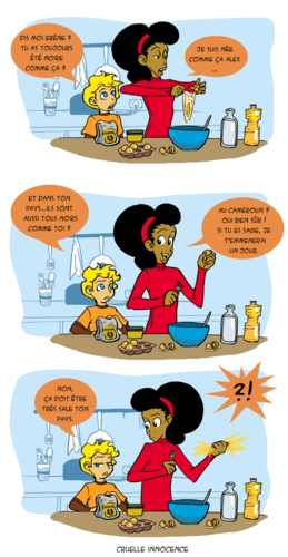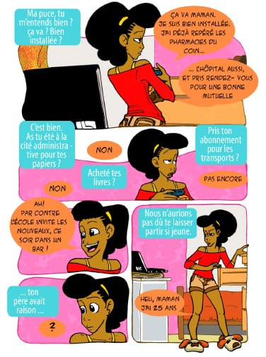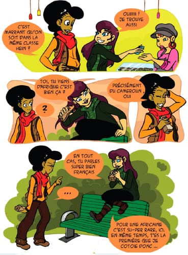 En todo caso, la protagonista de las historietas es una joven africana en Europa que debe enfrentarse a una vida lejos de su lugar de origen y también a cómo ven los europeos a los africanos. La joven Ebène hace frente a problemas de su edad como no sentirse a gusto con su cuerpo o a las complicadas relaciones con los hombres y con sus amigas. En Bélgica, hace frío, hay nieve y, sobre todo, europeos con una visión muy particular de los africanos, como el niño que se pregunta si Ebène es negra desde su nacimiento y al enterarse de que sí, sobreentiende que su país debe ser un lugar muy sucio; o la compañera de clase que se asombra de que una camerunesa hable tan bien el francés. Así que Ebène es la voz de las jóvenes, la de las mujeres, la de las migrantes, la de las soñadoras y la de las africanas y, además de retratar la vida, rompe estereotipos.