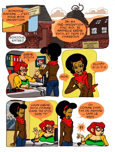 Elyon’s explica que cuando buscaba editor, sus interlocutores, por ser una autora camerunesa, esperaban que en sus páginas hubiese paja, o piraguas o cauris como moneda, ante la negativa se mostraban desilusionados. Entonces pedían, como mínimo que la protagonista fuese una “sin papeles”, pero no es así, Ebène Duta tiene toda su documentación en regla y, entonces, por arte de magia, el cómic dejaba de ser africano para ellos. Y sin embargo, contra el criterio de todos esos expertos en publicaciones, la joven Ebène ha conseguido que millares de personas se identificasen con sus desventuras y más de 17.000 en 43 países siguen sus evoluciones en Facebook.