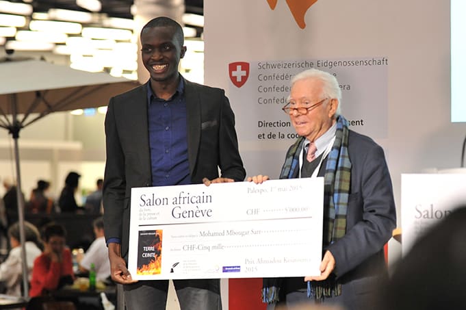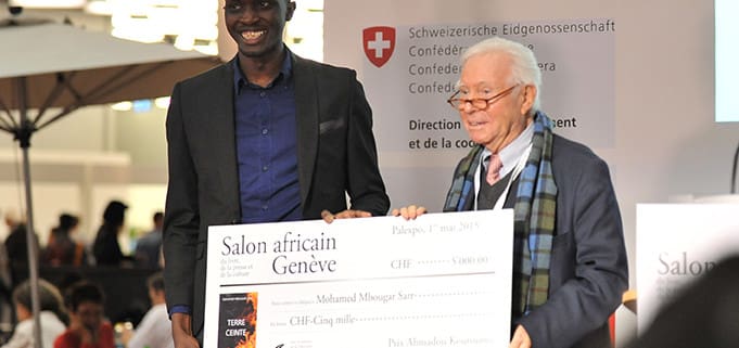 Mohamed Mbougar Sarr, a la izquierd, en el momento de recibir el premio Ahmadou Kourouma. Fuente: Salón del libro de Ginebra