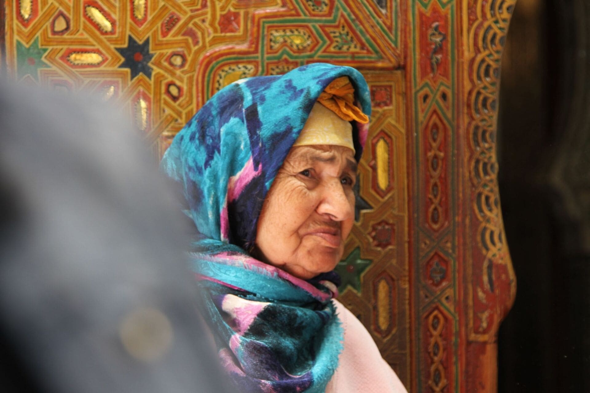 Una mujer marroquí mendiga delante de la puerta de una mezquita, en la Medina de Fez. Fotografía de Gemma Solés i Coll / Wiriko.