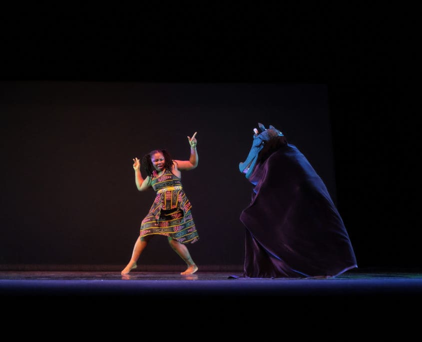 ML: Hay cinco máscaras en la obra y son elementos principales. La más importante es la del hipopótamo Mali realizada por el artista y diseñador Británico-libanés Sean Mackaoui. Konan Koffi da vida a Mali con esa máscara y le hace bailar, hablar y entablar una gran amistad con nuestra protagonista Sayo, interpretada por Bintou Sanogo.