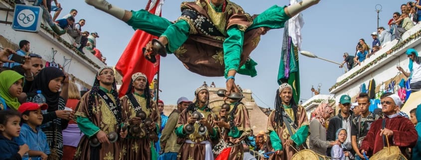 Vinculada a las prácticas de curación a las personas poseídas por espíritus genios, la música Gnawa se ha convertido en uno de los estilos más populares del norte de África. Batería, castañuelas metálicas, laúd de tres cuerdas (guembri), vestidos de mosaico y gorras decoradas con caracoles cowry, forman parte de un estilo musical que mezcla sonidos del Sur del Sahara, tradiciones bereberes y sufíes en un frenesí contagioso, infusionado entre poesía y música tradicional indisociable del baile, que ha sido atracción turística en las últimas décadas en ciudades como Marrakech, Essaouira y Fez.