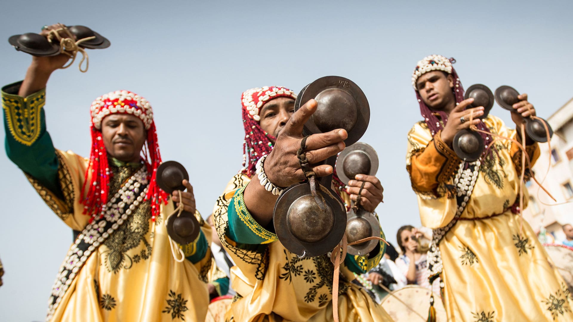 Cuentas cosidas a mano y conchas que van y vienen al son de la música engalanan a los Gnawa, vestidos con largas túnicas de satén y borlas que hacen girar alrededor de sus cabezas mientras cantan, saltan y bailan. Reclamando descender de Bilal, esclavo abisinio liberado y único discípulo negro de Mahoma —según Deborah Kapchan en Traveling Spirit Masters—, su música se remonta a las canciones que los africanos negros esclavizados integraron en el paisaje cultural y social marroquí, fundando todo un modelo cultural para preservar las tradiciones y la música folclórica de sus antepasados. Ahora, todo ese legado podría ser reconocido por la UNESCO como Patrimonio Cultural Inmaterial, no solo reconociendo la riqueza sonora del estilo, sino además, alabando la diversidad cultural implícita en el ADN marroquí.