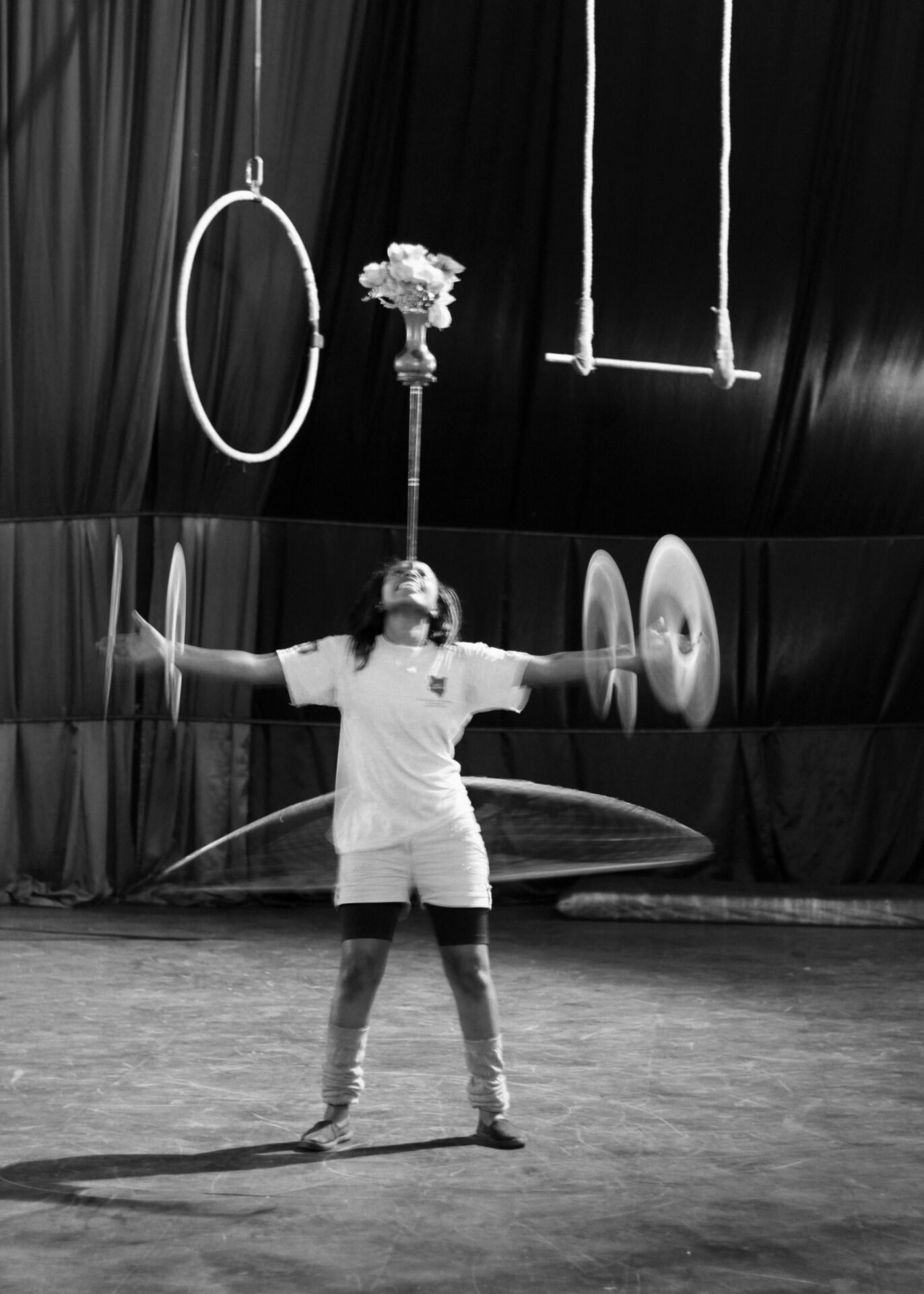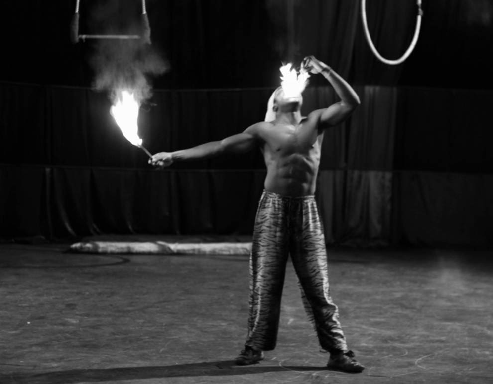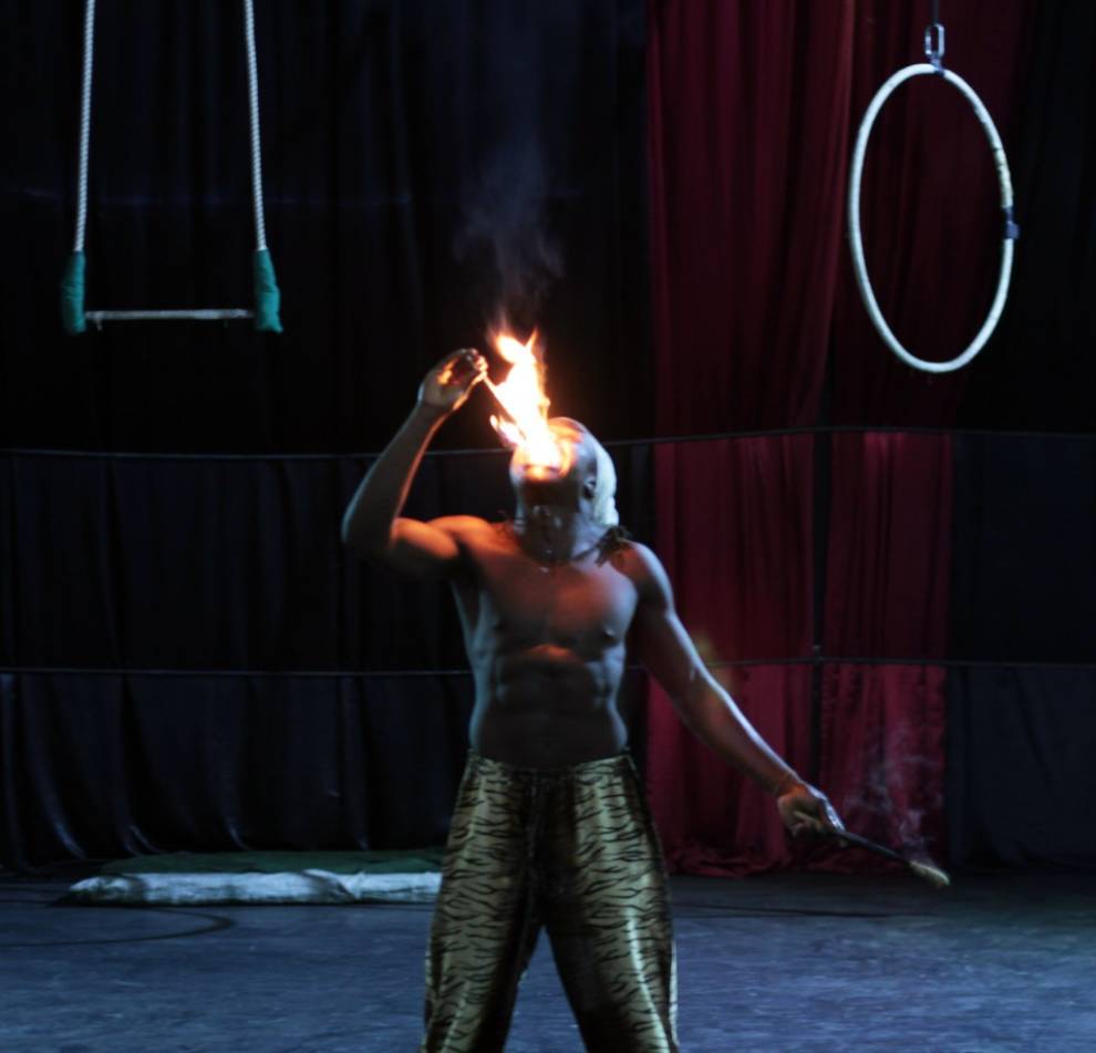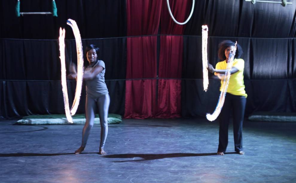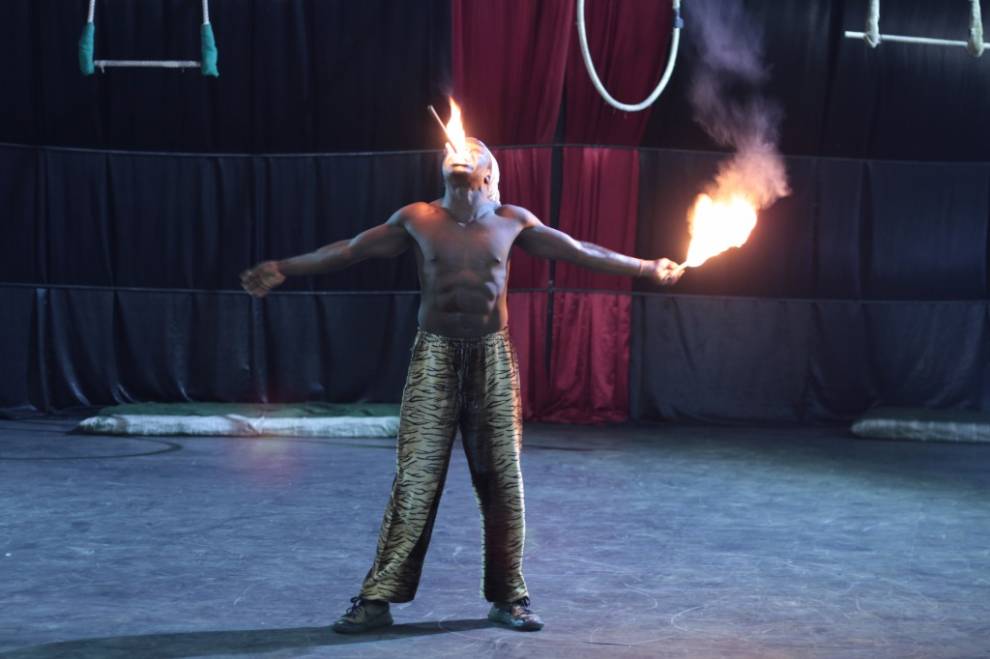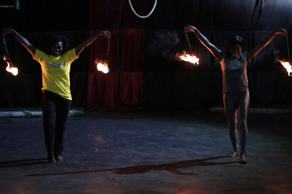 Pero no sólo el baile inunda las salas de Sarakasi Dom. En la planta baja del edificio se escuchan chirridos de gomas de zapatillas. Asomamos la cabeza y comprobamos como cinco jóvenes construyen una estructura humana. Dos chicas se contorsionan una encima de la otra. Nos dejamos llevar por los sueños del circo keniano y nos maravillamos como niños chicos ante cualquiera de los números que están ensayando. Rápidamente, el profesor John Washika los organiza para mostrarnos sus virtudes. Malabares con fuego, acrobacias en el aire…