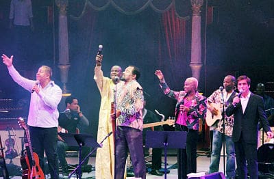 De izquierda a derecha: Teofilo Chantre, Ismael Lo, Bonga, Angelique Kidjo y Camané. Foto tomada el 28/09/2012, durante el Tributo a Cesaria Evora en el Cirque d’Hiver de Paris. Autor: Nkrumah Lawson-Daku/Lusafrica.