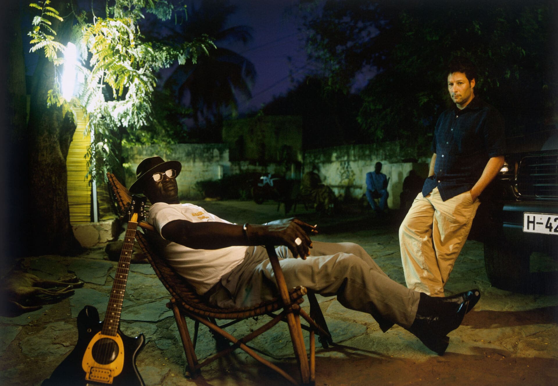 Ali Farka Touré, junto a Nick Gold, relajados delante de los Estudios Bogolan. Imagen de Jonas Karlsson.