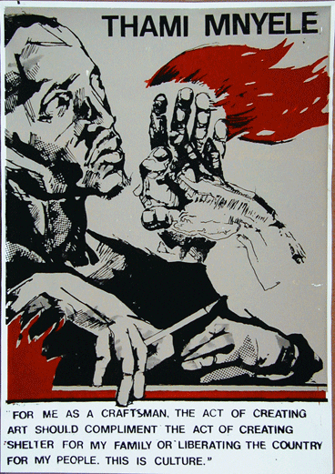 “El tema de esta exhibición es ‘Arte para el desarrollo social’, pero me tengo que apresurar a preguntar, ¿qué arte? ¿qué desarrollo social? El acto de crear arte no es diferente del acto de construir un puente — es el trabajo de muchas manos—. Por lo tanto el arte es social, como lo son otras formas de arte como la escritura, el teatro, la música y más. Eso significa que el arte es parte y parcela de las reglas y leyes que gobiernan las sociedades. Entonces, el hecho de que en Sudáfrica la mayoría de la gente está comprometida en una lucha por la liberación, significa que el arte y los trabajadores culturales no pueden estar divorciados de este proceso”. (Extraído de ‘Red on Black. The story of South African Poster Movement’. Traducción propia).