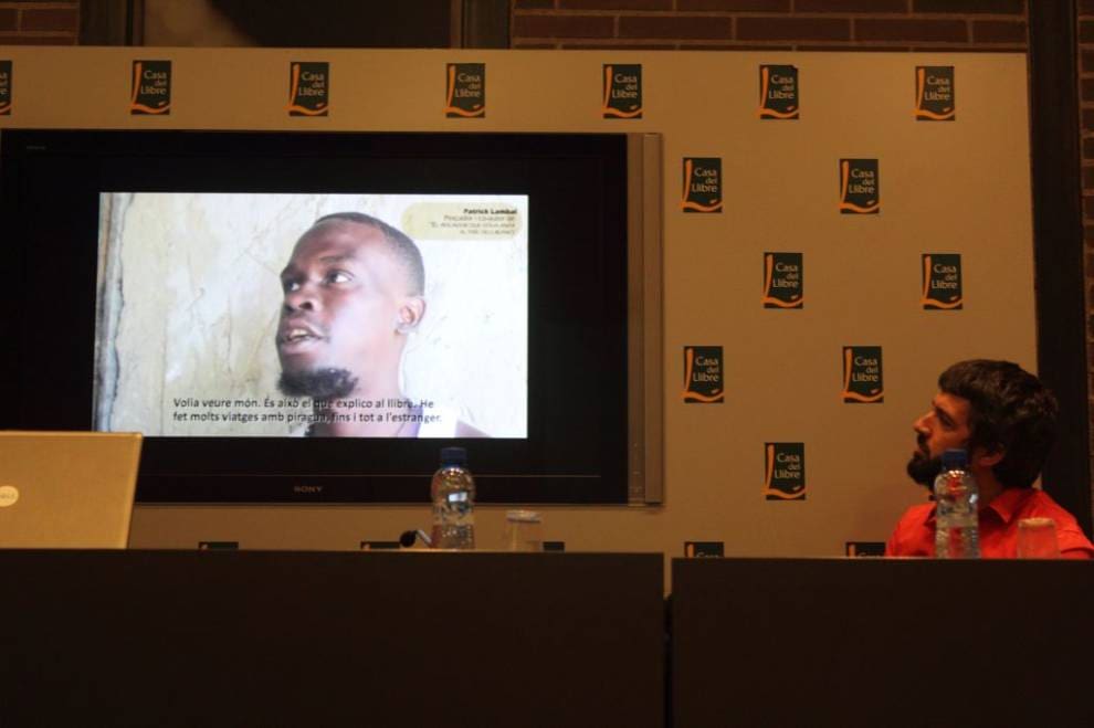 Jordi Tomàs observa un vídeo en el Patrick Lambal explica desde Senegal porqué ha participado en el libro. Ambos firman El pescador que volia anar al país dels blancs.
