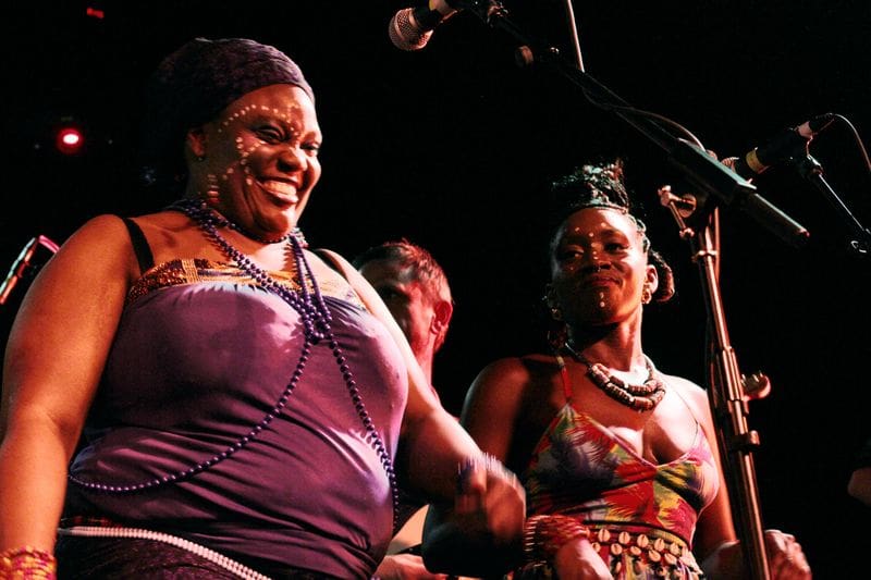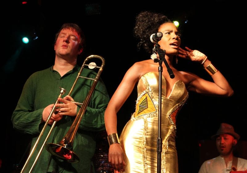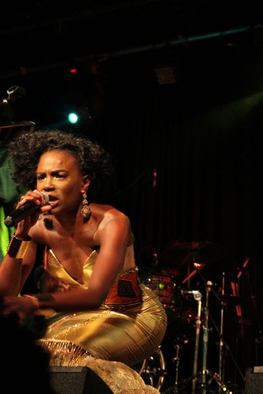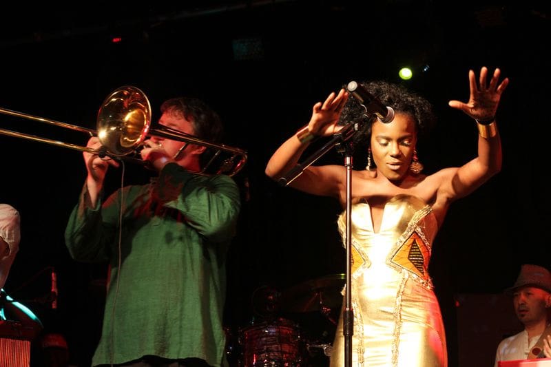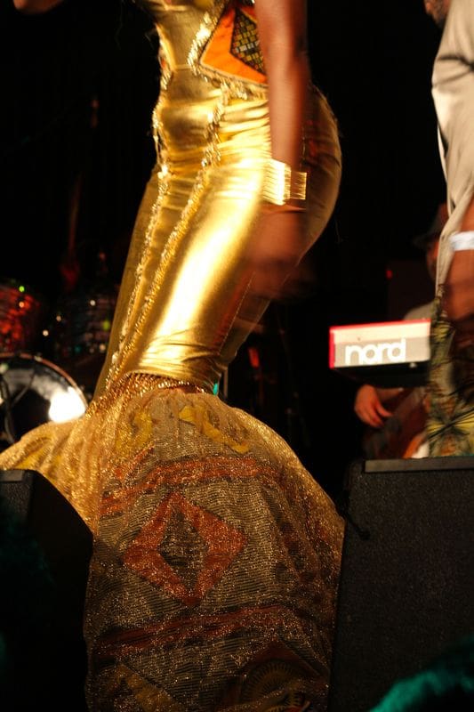 Esta invocación espiritual estuvo presente durante todo el concierto. “¡Queremos saludar a nuestro amigo y Dios Fela Kuti”, repetía Dele Sosimi tras una hora de concierto. Fela llegó a convertirse en una de las figuras más respetadas de Nigeria en los años 70. Su influencia perdura hasta hoy, y se perpetua a través del afro-beat. Pero se dio en el concierto un tipo de invocación especialmente curiosa, con la estética que emanan las “queens” que formaban parte del propio Fela. La vocalista de las Noisettes, la hermosa Shingai Shoniwa, entra en escena cual sirena dorada. A Breis no le convence el asombro silencioso del público y le provoca, preguntándole si quieren fiesta o no. Shingai Shoniwa sigue erguida y dorada en el centro de la escena. Breis, a su lado, pregunta al público “¿es esta una señorita o no?”. Sin perder el ritmo ni la dramatización de la performance, improvisa un rap a base de distintos registros de la palabra “lady”, a los que la musa Shingai responde corporalmente, con movimientos tan limpios como elegantes, reproduciendo la fuerza de la belleza de las mujeres que rodeaban al dios Fela. Reproduciendo también el mito del Dios Fela. El presidente negro era también conocido por su discurso abierto sobre el sexo. Fela tenía 15 esposas (Remi, Naa Lamiley, Aduni, Kevwe, Funmilayo, Alake, Adejonwo, Najite, Adeola, Kikelomo, Ihase, Omowunmi, Omolara, Fehintola y Sewaa), que según él la prensa sensacionalista siempre frivolizaba por el tabú que había sobre el sexo. El culto que Fela le rendía se manifestaba no sólo a través s de sus letras, como en “Na Poi”, otro de los títulos estrella de la noche, sino también a través del cuerpo femenino en escena, que solía dedicar grandes momentos de solos de las bailarinas de Afrika 70, tales como Aduni Idowu, Funmilayo Onilere, Omolara Shosanya, altamente erotizados. De repente, ese solo erotizado de Shingai Shioniwa se convierte en una suave transición al tema “Lady”, de Fela, gracias a esa invocación provocada por Shingai Shoniwa, una especia de figura mitológica, heroína del Dios Fela, que amaba a sus mujeres en cada una de sus múltiples bellezas por la perfección de cada una de ellas en el desempeño de sus tareas. Tal vez, de hecho, se le pueda criticar a este concierto la escasez de Queens, quizás por falta de espacio en escena, pues sólo hubo dos coristas femeninas, a veces acompañadas por los saxos y el trombón de la Afrobeat Orchestra, indispensables sin embargo para dar la réplica y que la música continúe.