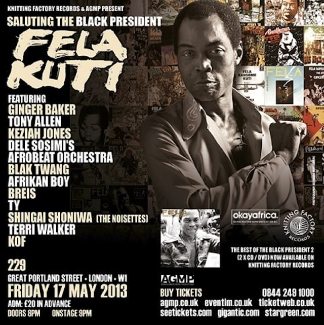 Juntos celebran la reedición de la antología del Fela, The Best Of The Black President 2, un músico que produjo más de 50 álbumes, de la discográfica Knitting Factory Records en asociación con AGMP, una de las promotoras líderes de eventos musicales en Londres. El público, si bien no suman las 10.000 personas que solían asistir a las actuaciones de Afrika 70, durante los años de mayor éxito del cantante, en la década de los 70, sí reproducen a pequeña escala, 700 personas, el espíritu de la diversidad de públicos atraídos por la música de Fela, desde otros músicos y amantes de la música a radicales, activistas, estudiantes y demás personas, tanto nigerianas, como de la diáspora africana, como jóvenes británicos y de otras nacionalidades, a sus pasos por Londres.