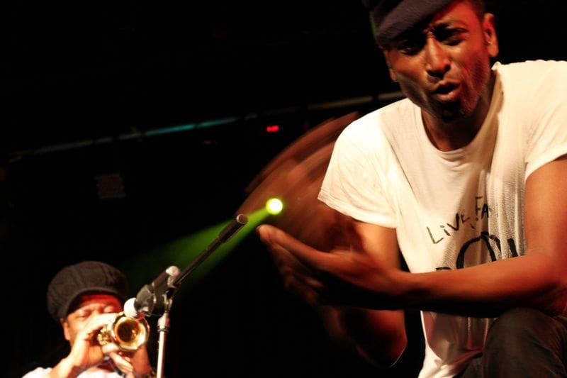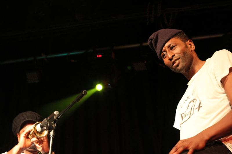 Por fin. Dentro. La sala destaca por su ambientazo, en el que se establece un diálogo continuo entre los propios artistas, y entre los artistas con su público, al estilo Fela. Con la libertad de que los músicos puedan bajar del escenario a bailar con el público de las primeras filas, y volver tan tranquilamente. Es éste el caso del artista TY, tras interpretar uno de los temas más populares de Fela, “Zombie”.