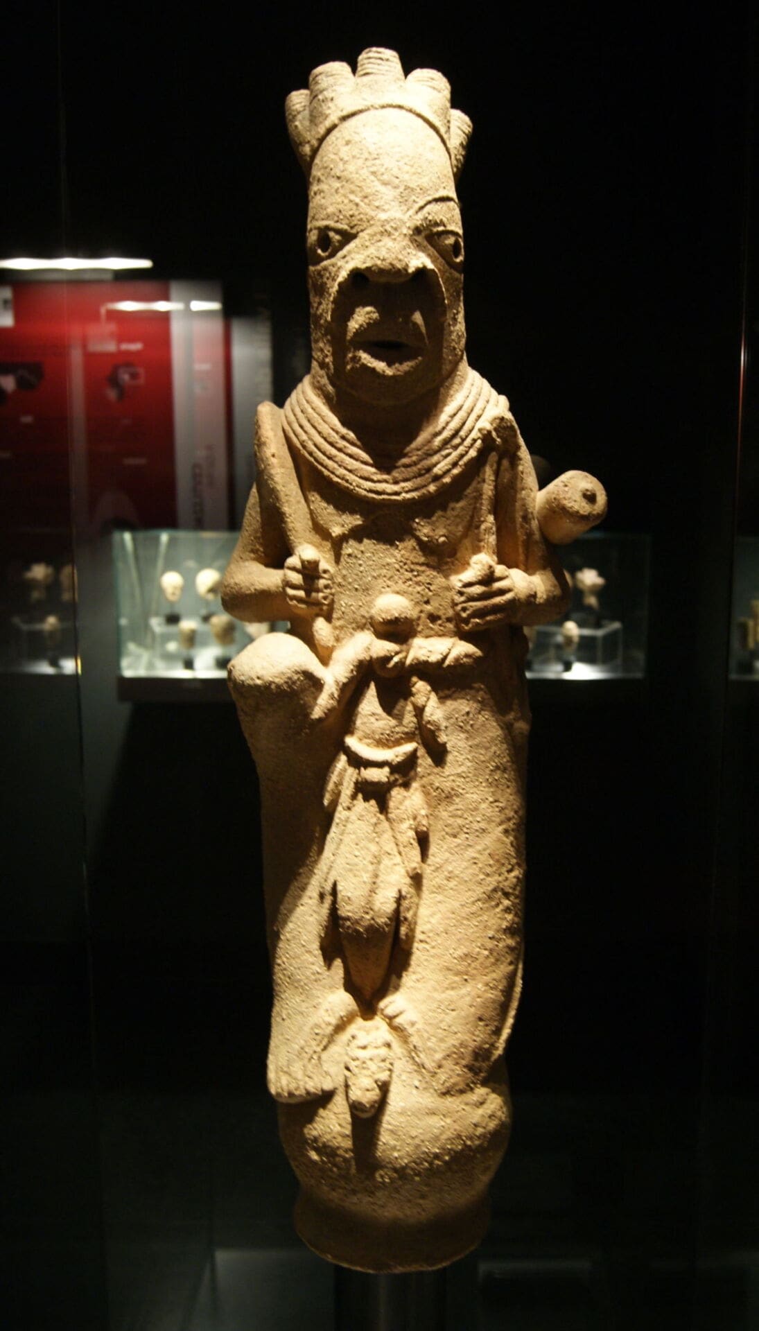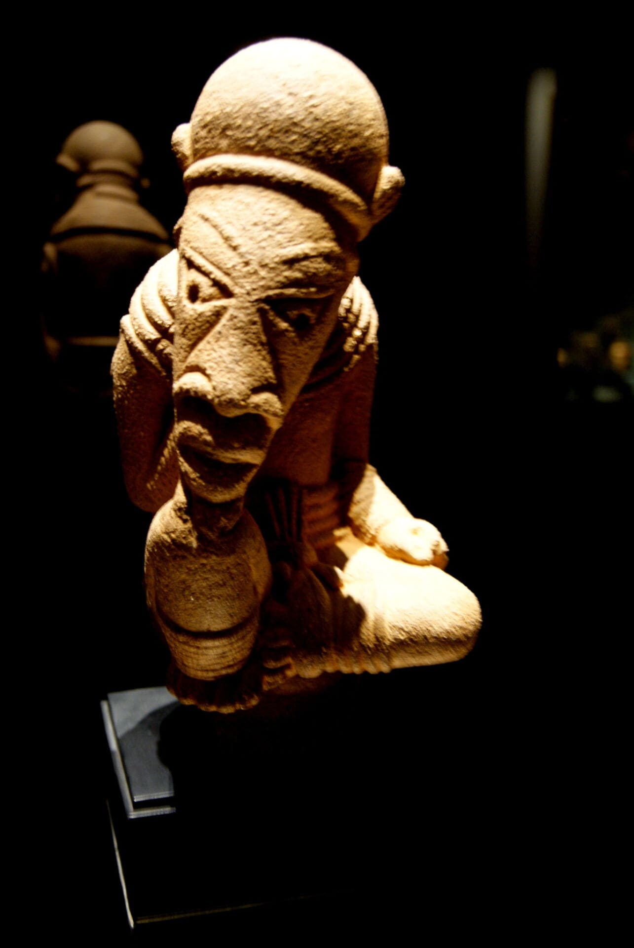 La entrevista podía esperar un poco; iba a conocer de primera mano la exposición. Nos dirigimos al Salón de Rectores, la primera sala donde los visitantes comienzan a tener un primer contacto con las artes africanas. No tardamos en entrar en la Sala del Renacimiento, la joya de la corona. Aquí se encuentran las principales esculturas y las más admiradas por todo el que pasa por el museo. Cuenta en sus haberes con quince esculturas de la desaparecida cultura Nok de Nigeria, de la que sólo se han hallado mil piezas o una cabeza del rey de Benín, algo extraordinario ya que actualmente sólo se han localizado diez figuras de este tipo en todo el mundo.