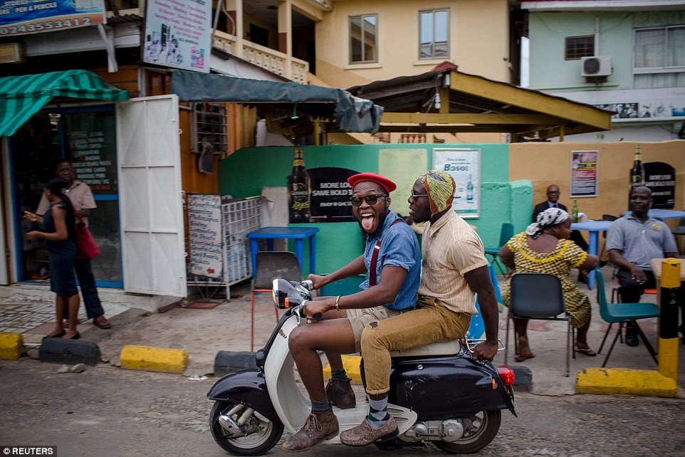 El estilista ghanés Daniel Quist (conduciendo la scooter) y el pionero de la moda DJ Evans Mireku Kissi – más conocido como Steloo-, por las calles de Accra. Imagen de Reuters.