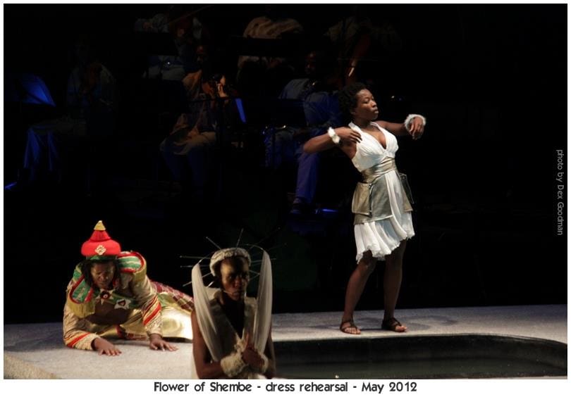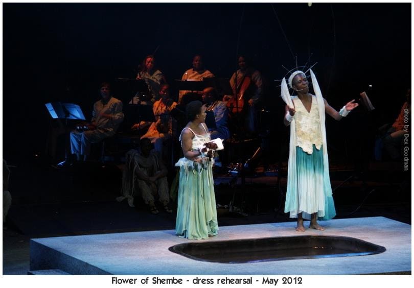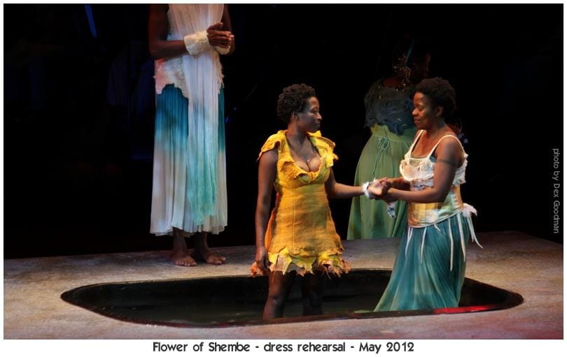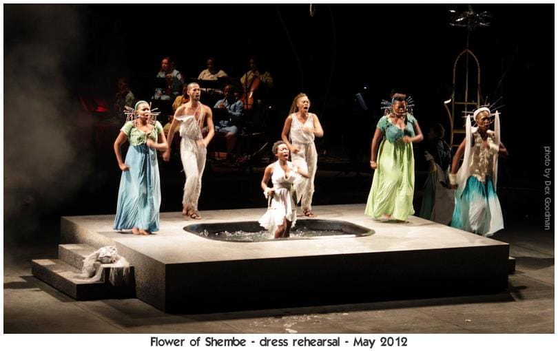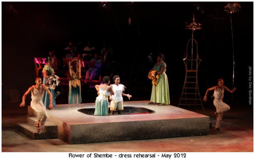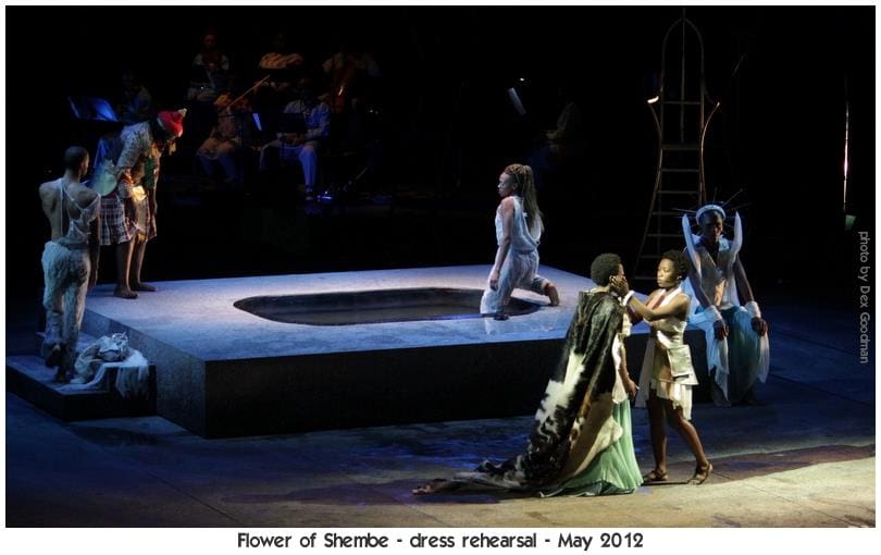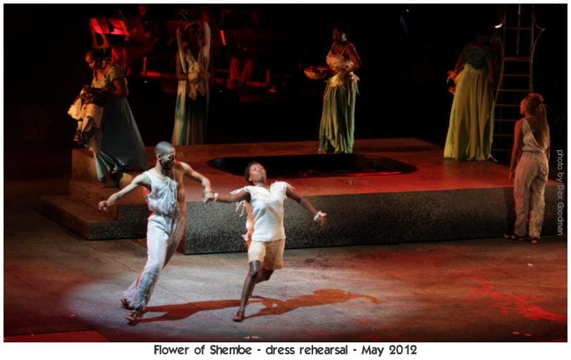 La opereta “The Flower of Shembe” es un mito repleto de mesías, una obra a veces turbadora, a veces entusiasta, donde la imaginación transforma los caracteres de hombre a mujer o de mujer a hombre, donde se desafían los roles de género de una sociedad fuertemente marcada por el sexo con el que se nace, en la que el destino se convierte en algo contra lo que luchar y algo ineludible a la vez, o en la que la magia de la fe se erige como verdadera esperanza de la humanidad. Se trata de un melodrama que reta a los ideales de la burguesía y convierte la ópera en un espectáculo para los pobres. Para los africanos. En él, la estética del arte povera de los años 70 inunda el escenario de flores gigantes hechas con chatarra u otros materiales reutilizados, mostrando diferentes maneras de transformar la realidad, postrada bajo el filtro surrealista de los juegos de luces.